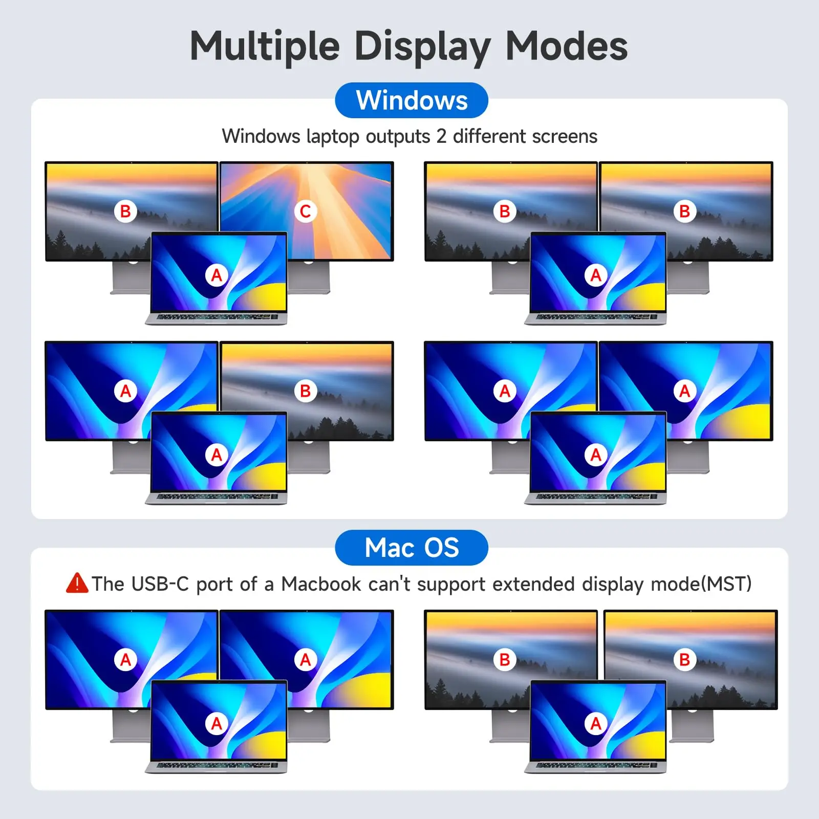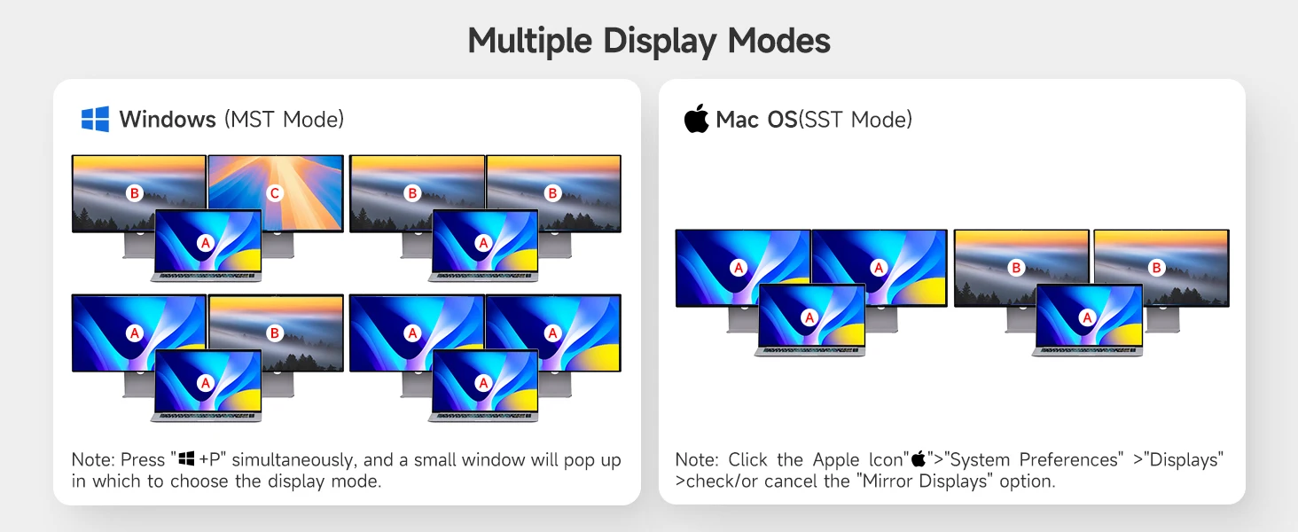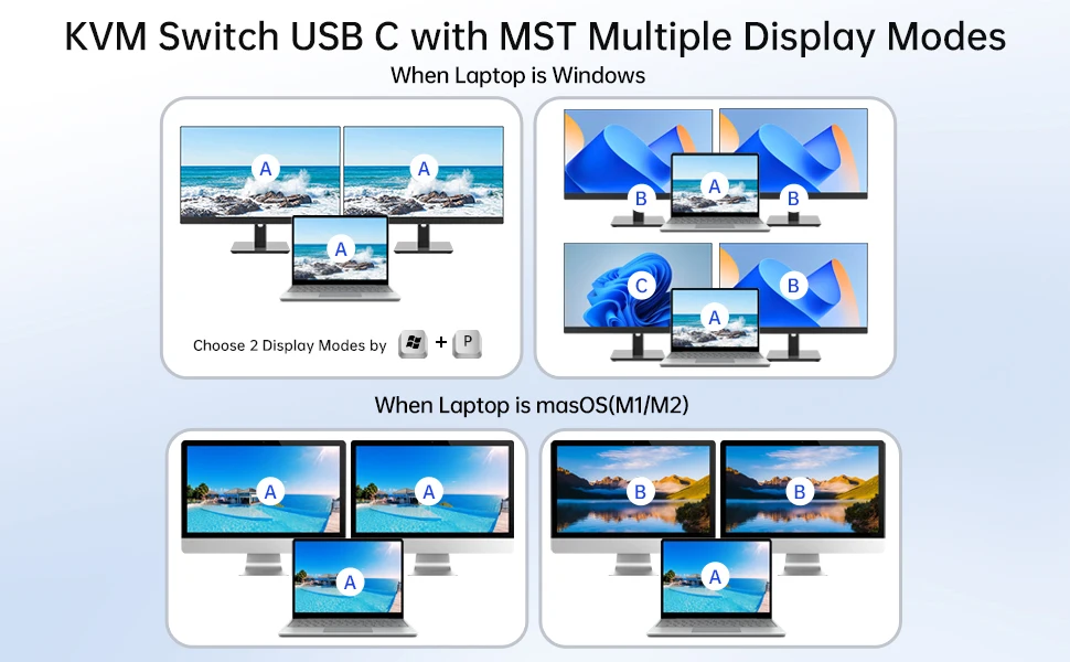 【MST가 포함된 USB C KVM】확장 모드: 확장 모드는 세 가지 다른 화면을 출력할 수 있으며, 미러 모드는 세 가지 동일한 화면을 출력할 수 있습니다. 참고: Mac M1, M2는 MST(다중 스트림 전송)를 지원하지 않으므로 2개의 외부 모니터로 확장되는 화면은 동일합니다.
