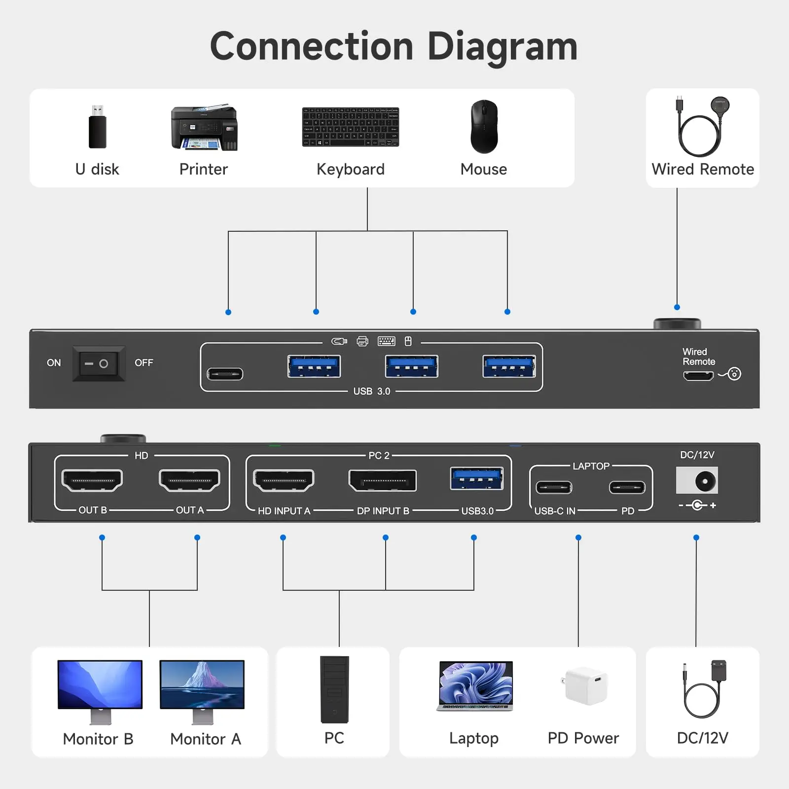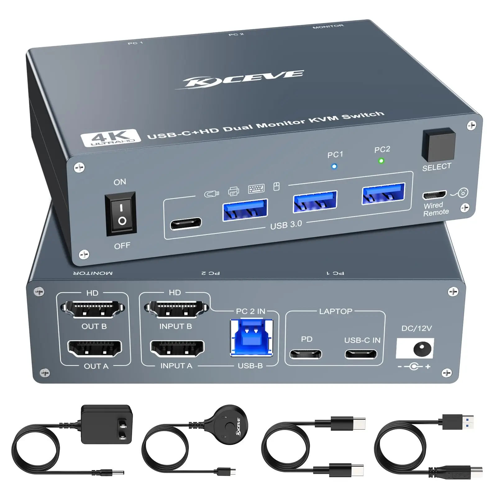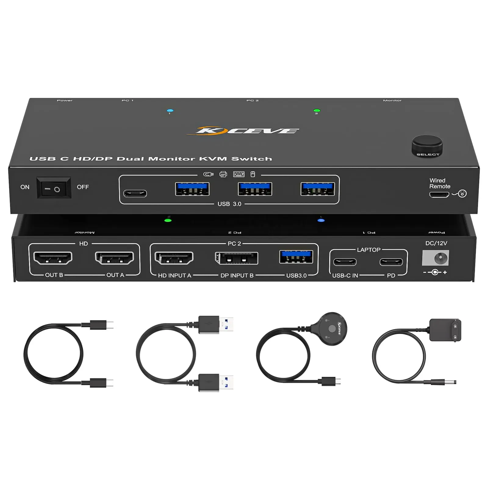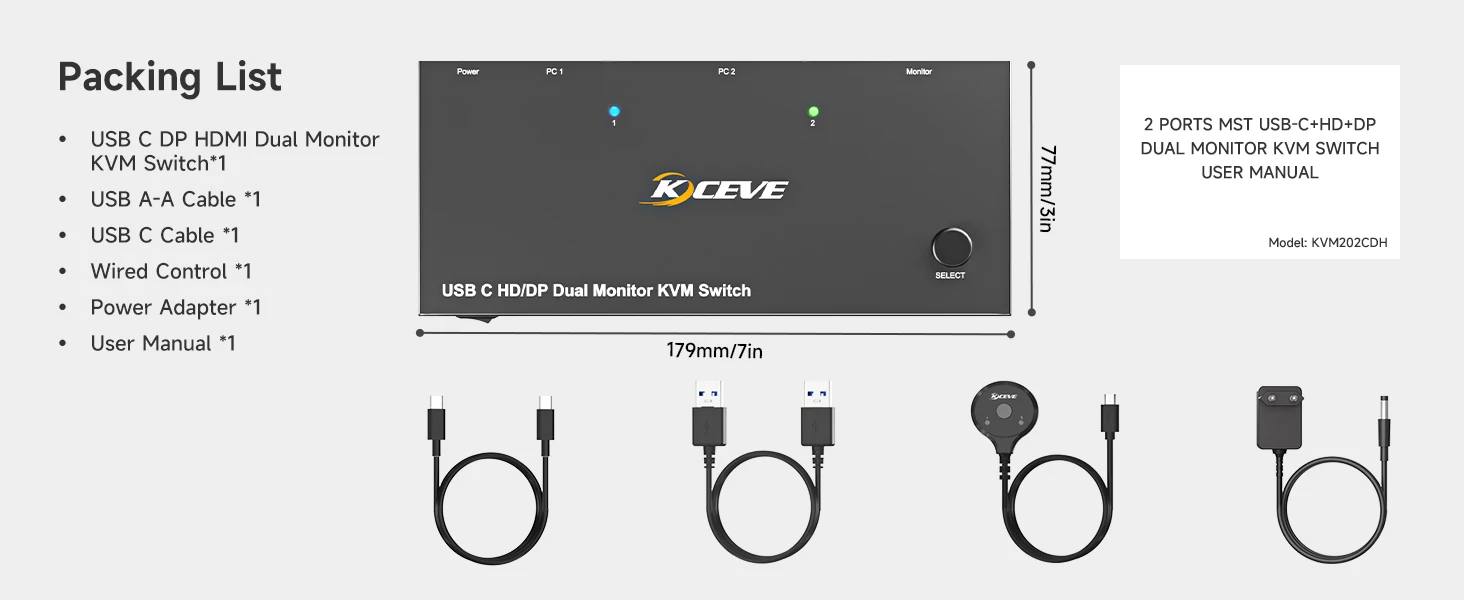 【당신이 얻는 것】1* USB C KVM 스위치; 1*USB C 케이블(0.8M); 1*USB AB 케이블(1.5M); 1*유선 리모컨(1.5M); 1*12V/2A POWER LOGIC 어댑터 및 1*사용자 설명서.