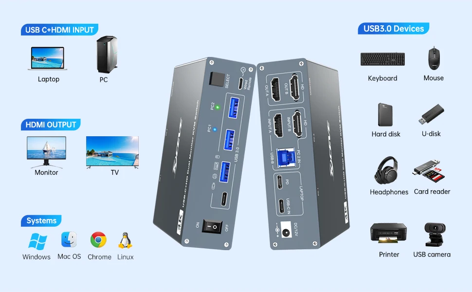 USB 3.0 포트 4개:USBA 3개 + USBC 포트 1개가 있는 USB C 듀얼 모니터 KVM 스위치는 무선 키보드, 마우스, 프린터, 스캐너 및 기타 USB 장치를 안전하게 감지합니다.USBC 스위치는 5Gbps의 초고속 데이터 전송을 지원하며 USB 2.0/1.1과 역호환됩니다.