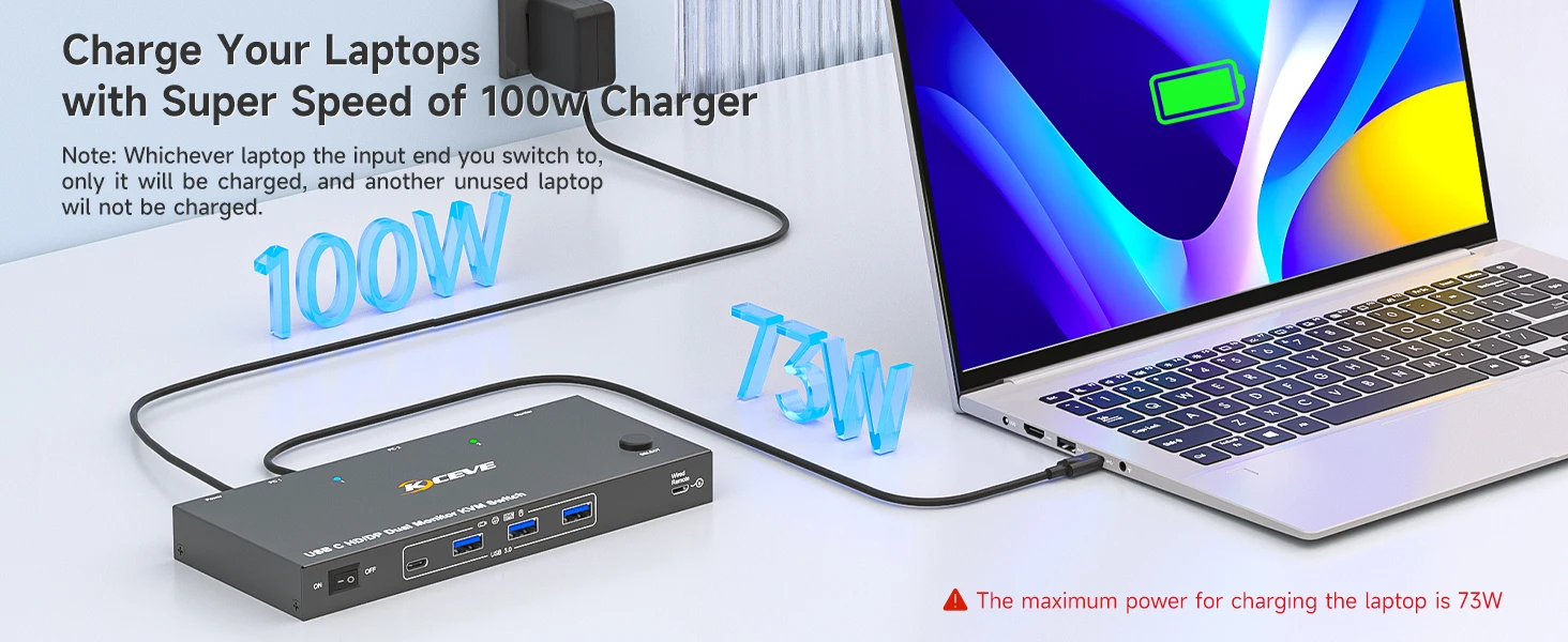 【노트북용 80W PD】USBC HDMI KVM 스위치는 PD 충전 포트로 설계되어 사용 시 노트북에 충분한 전력을 제공할 수 있으며 듀얼 모니터 USB C KVM 스위치는 노트북에 80W 충전 전력을 제공합니다.그러나 KVM 스위치와 케이블의 전력 소모로 인해 노트북에 전달되는 최종 전력은 73W~80W 범위입니다.