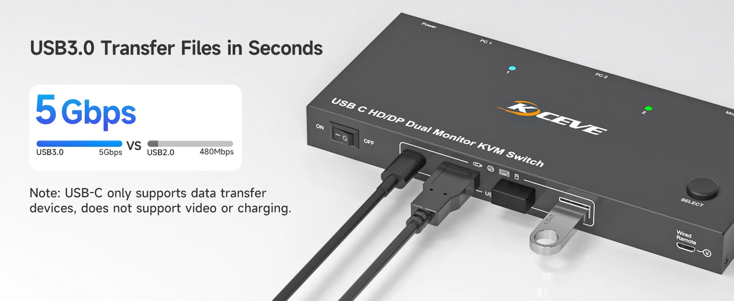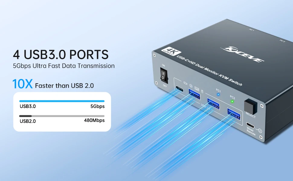 【고속 파일 전송5Gbps】4개의 USB 3을 갖춘 이 USB C KVM 스위치.마우스, 키보드, 스캐너 등을 공유하기 위한 0 포트이 듀얼 HDMI KVM 스위치는 초고속 USB 3을 지원합니다.최대 5Gbp/s의 데이터 전송 속도로 USB 2보다 10배 빠릅니다.0 포트, USB 2와 역호환됩니다.0 및 USB 1.1개의 장치