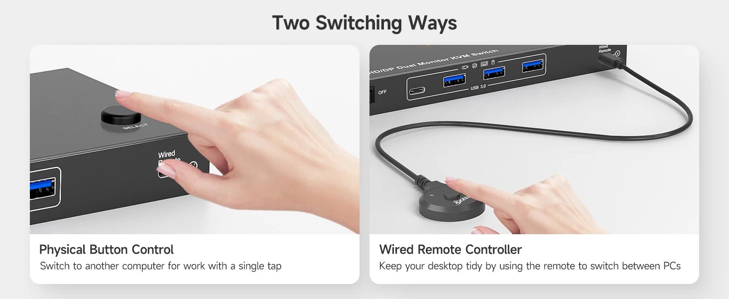 【2가지 간편 전환 모드】듀얼 모니터 KVM은 두 가지 전환 모드를 제공합니다.모드 1: 유선 컨트롤러 전환: KVM 스위치가 작업 공간 외부에 배치되면 유선 컨트롤러(포함)를 사용할 수 있습니다.모드 1: 패널 버튼 전환: KVM 스위치의 패널 버튼을 사용하여 2개의 컴퓨터 간을 전환하고 LED는 활성 컴퓨터를 나타냅니다.작업 효율성을 향상시키는 간단하고 빠른 전환 방법