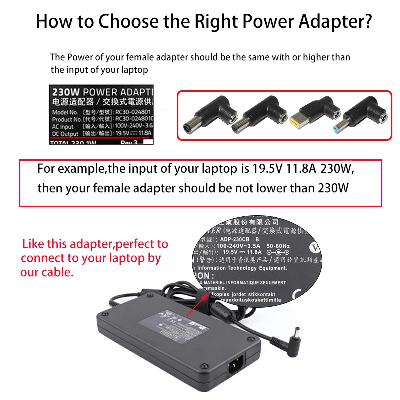 이것은 레노버 노트북을위한 5.5*2.5mm 암 스퀘어 플러그에서 DC POWER LOGIC 커넥터입니다, 그것은 240w 최대 전력을 견딜 수 있습니다, 즉, 우리의 커넥터는 Lenovo의 고성능 노트북에 적합합니다. 더 중요한 것은 여성용 노트북 어댑터 (5.5*2.5mm 커넥터 포함) 의 전원이 Lenovo 용 노트북의 요구 사항보다 낮지 않아야합니다. 예를 들어, 게임용 노트북 (Lenovo 용) 의 입력은 20V 11.5A 230 W이며 여성 노트북 어댑터는 230W 이상이어야합니다. 그렇지 않으면 작동하지 않습니다. 주문하기 전 꼼꼼히 확인해 주세요.