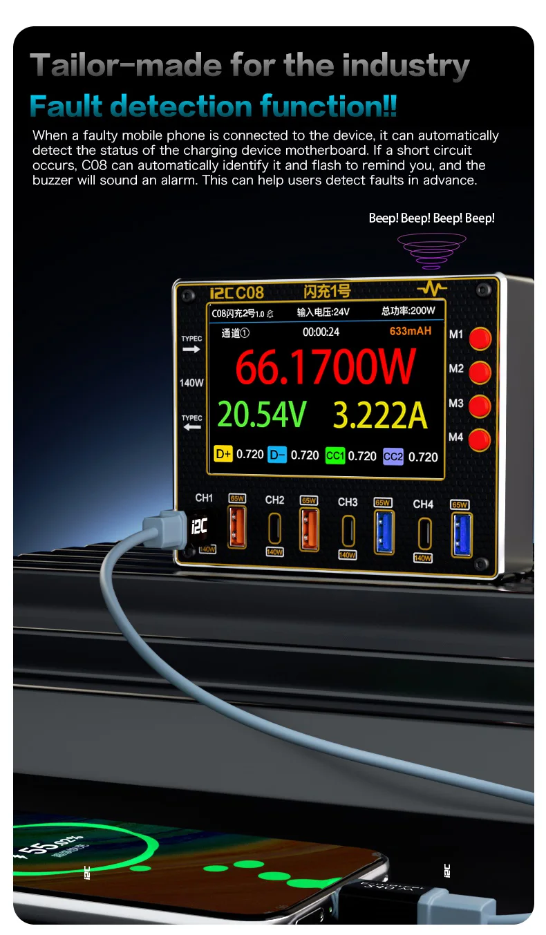 스마트 감지: 충전 , 단락(합선), 비정상적인 전압 변동을 자동으로 감지합니다.청각 부저 및 깜박이는 경고 시스템.