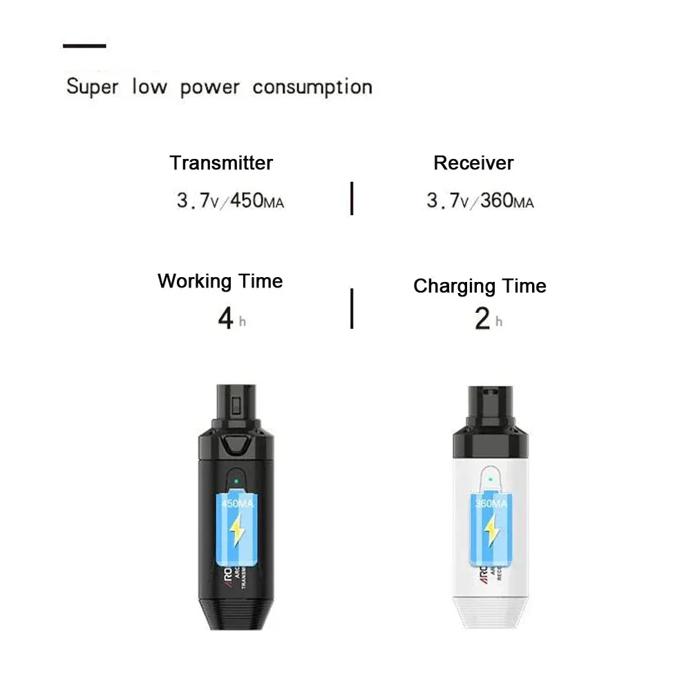 내장형 충전식 배터리, 낮은 전력 소비 및 긴 작업 시간(송신기 75mA, 수신기 60mA).