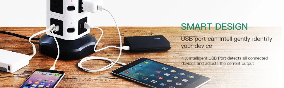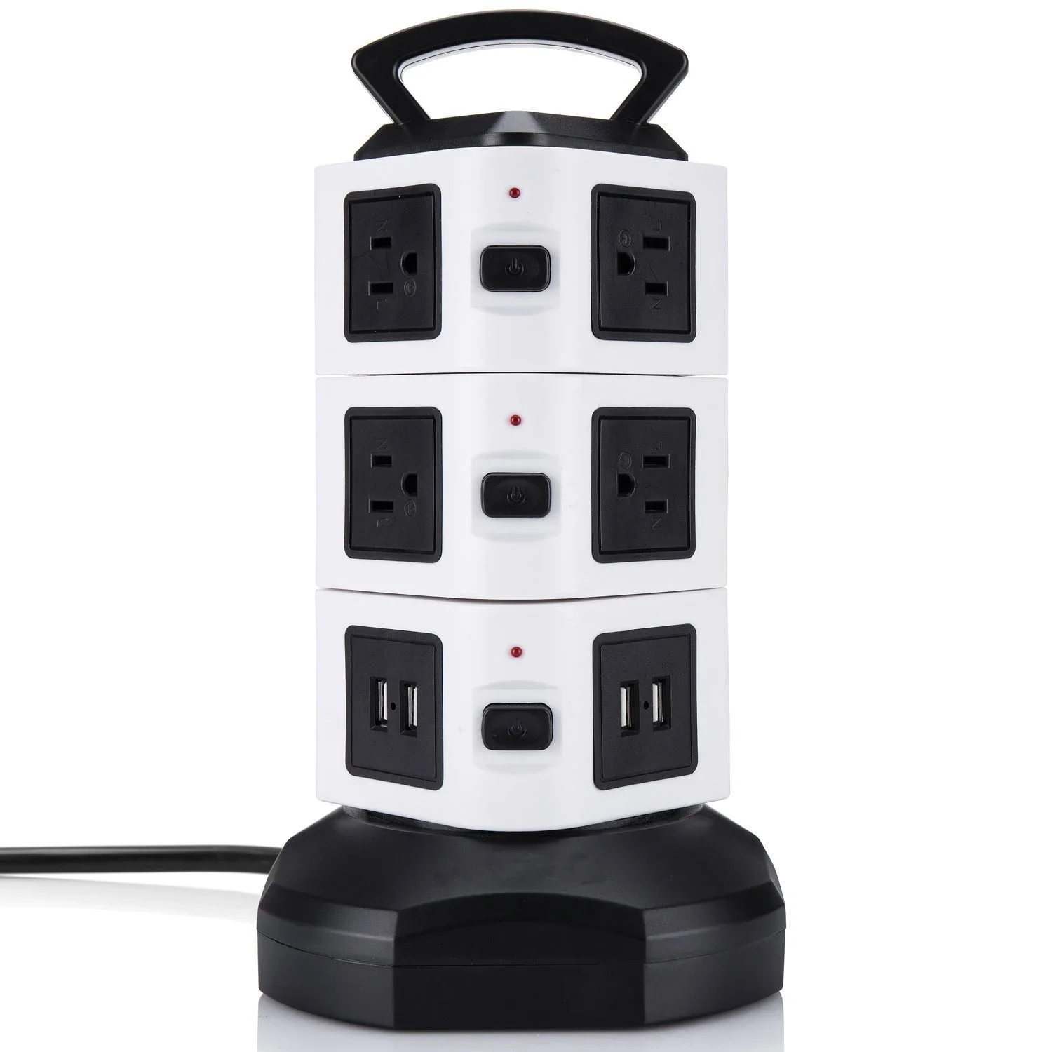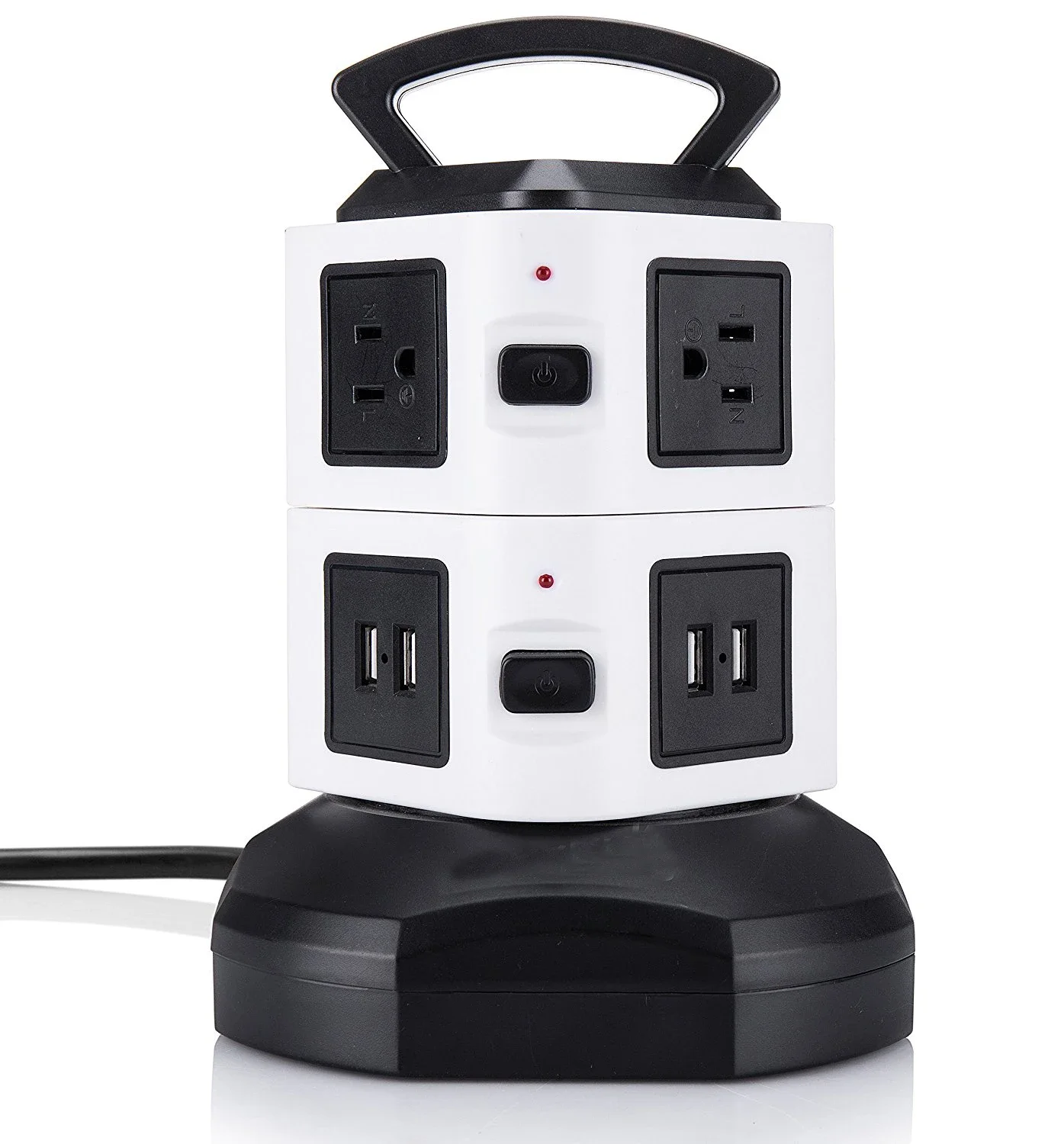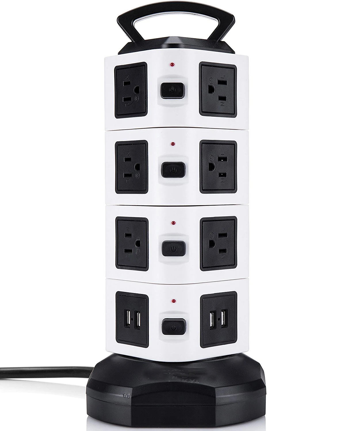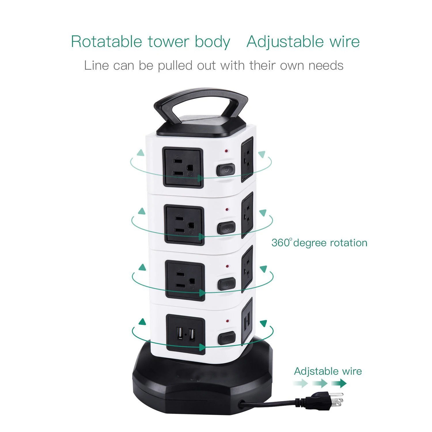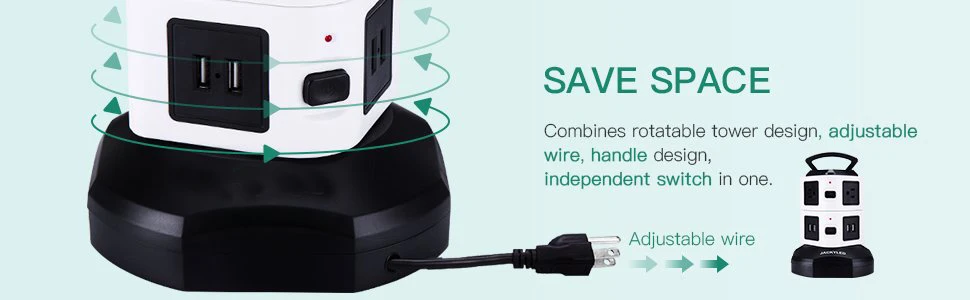 수직 콘센트 타워 디자인은 각 콘센트에 충분한 공간을 제공하고 기존 멀티탭에 비해 많은 공간을 절약하며 작업 영역의 다양한 코드를 청소합니다.6.하단의 5피트 길이 케이블 와이어는 타워를 회전시켜 확장하거나 축소할 수 있어 공간이 절약됩니다.상단에 내구성이 뛰어난 손잡이가 있어 쉽게 운반할 수 있습니다.각 레이어에 하나의 스위치가 있어 전력을 절약하고 멀티탭 서지 보호기를 쉽게 제어할 수 있습니다.