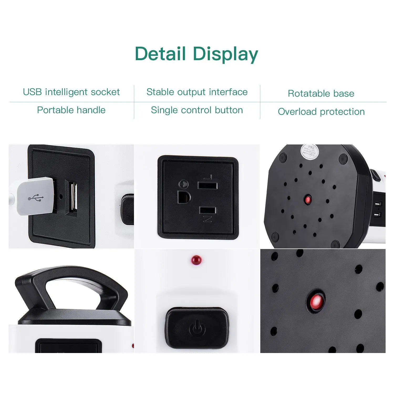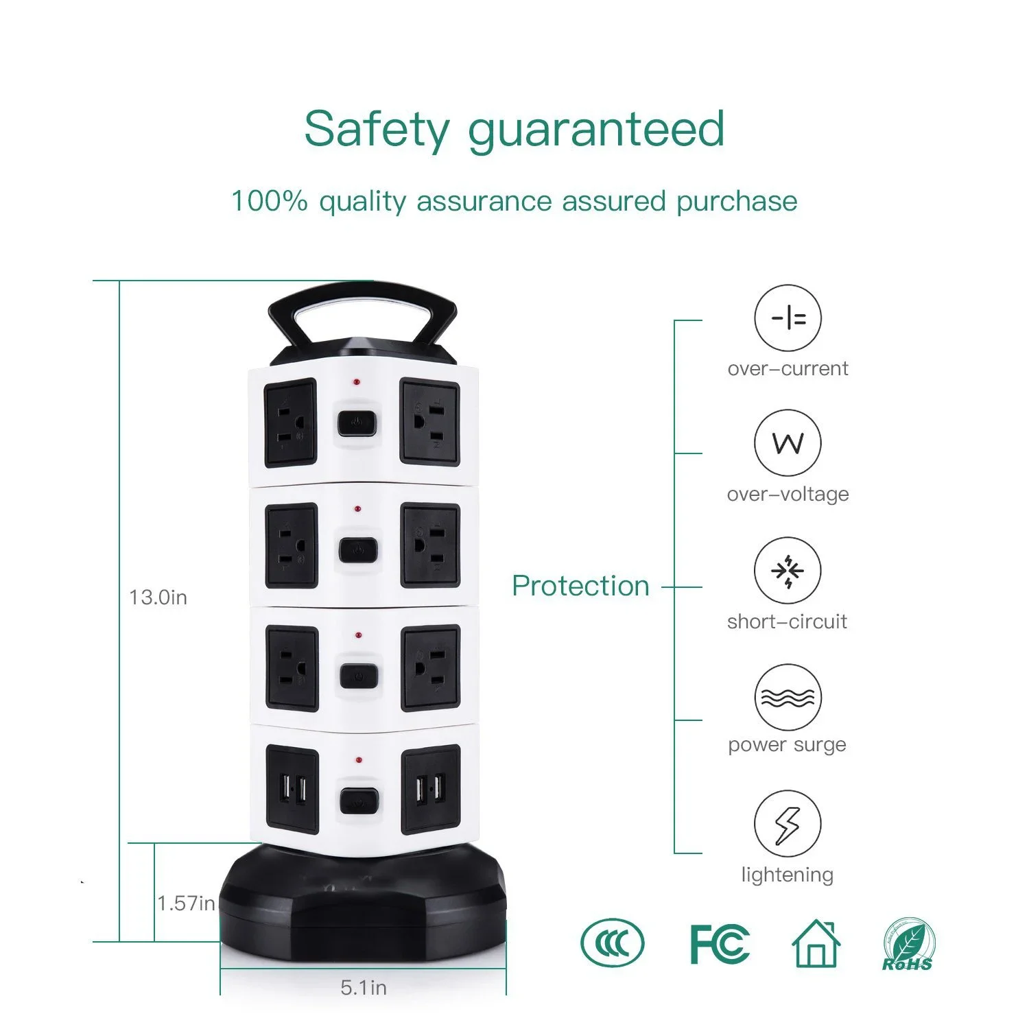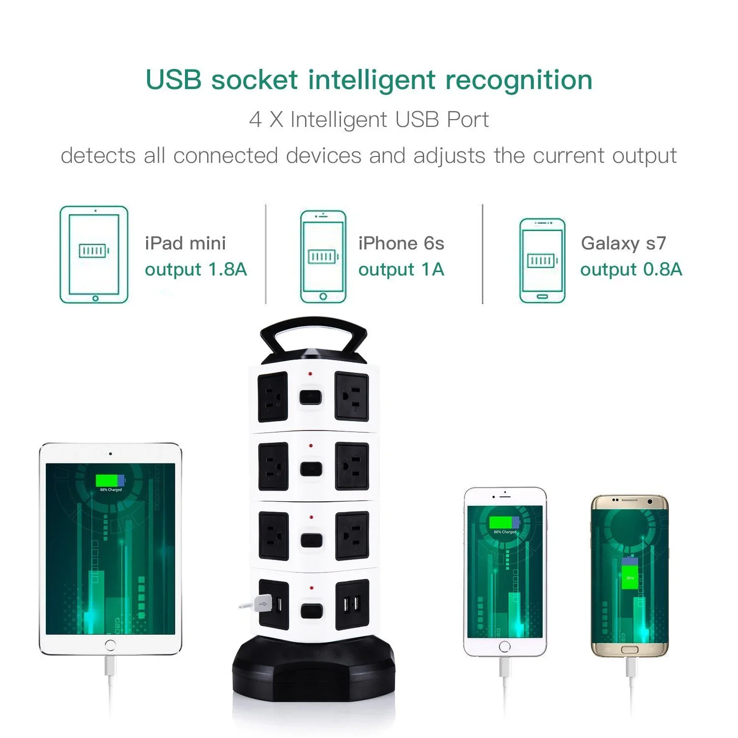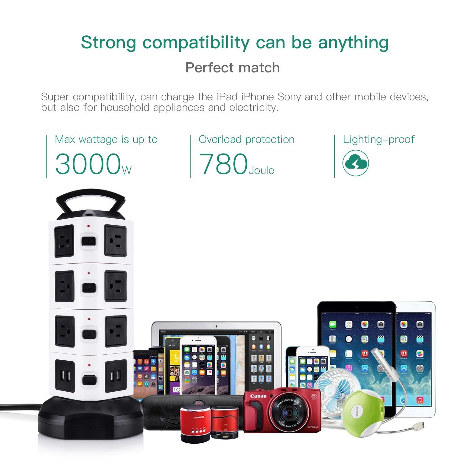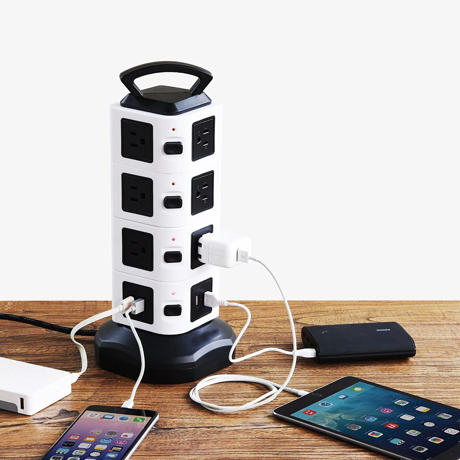 수직 콘센트 타워 디자인은 각 콘센트에 충분한 공간을 제공하고 기존 멀티탭에 비해 많은 공간을 절약하며 작업 영역의 다양한 코드를 청소합니다.6.하단의 5피트 길이 케이블 와이어는 타워를 회전시켜 확장하거나 축소할 수 있어 공간이 절약됩니다.상단에 내구성이 뛰어난 손잡이가 있어 쉽게 운반할 수 있습니다.각 레이어에 하나의 스위치가 있어 전력을 절약하고 멀티탭 서지 보호기를 쉽게 제어할 수 있습니다.