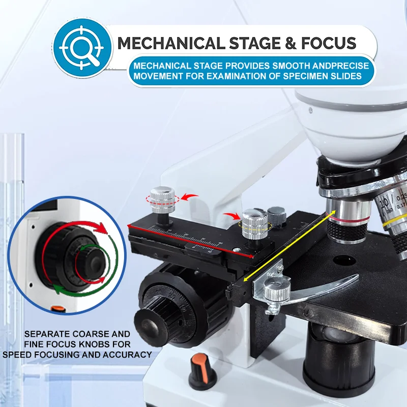 견고한 전체 금속 프레임과 동축 거친/미세 초점 조절 손잡이로 제작된 이 현미경은 ±2μm 수준의 초점 정확도를 위한 나선형 기어 전달 메커니즘을 통합합니다.이는 장기간 관측 중에도 안정적이고 선명한 이미징을 보장합니다.