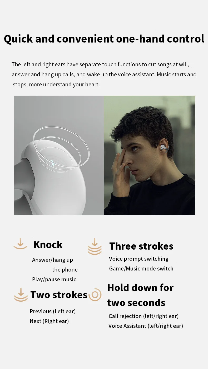무선 이어버드에는 터치 센서와 Bluetooth 5.3이 내장되어 있어 세게 누르지 않고도 빠른 반응이 가능합니다.부드러운 터치, 섬세한 제어 손가락 터치 제어 음악 재생/전화 응답/소음 제거 스위치/깨우기 SIRI.