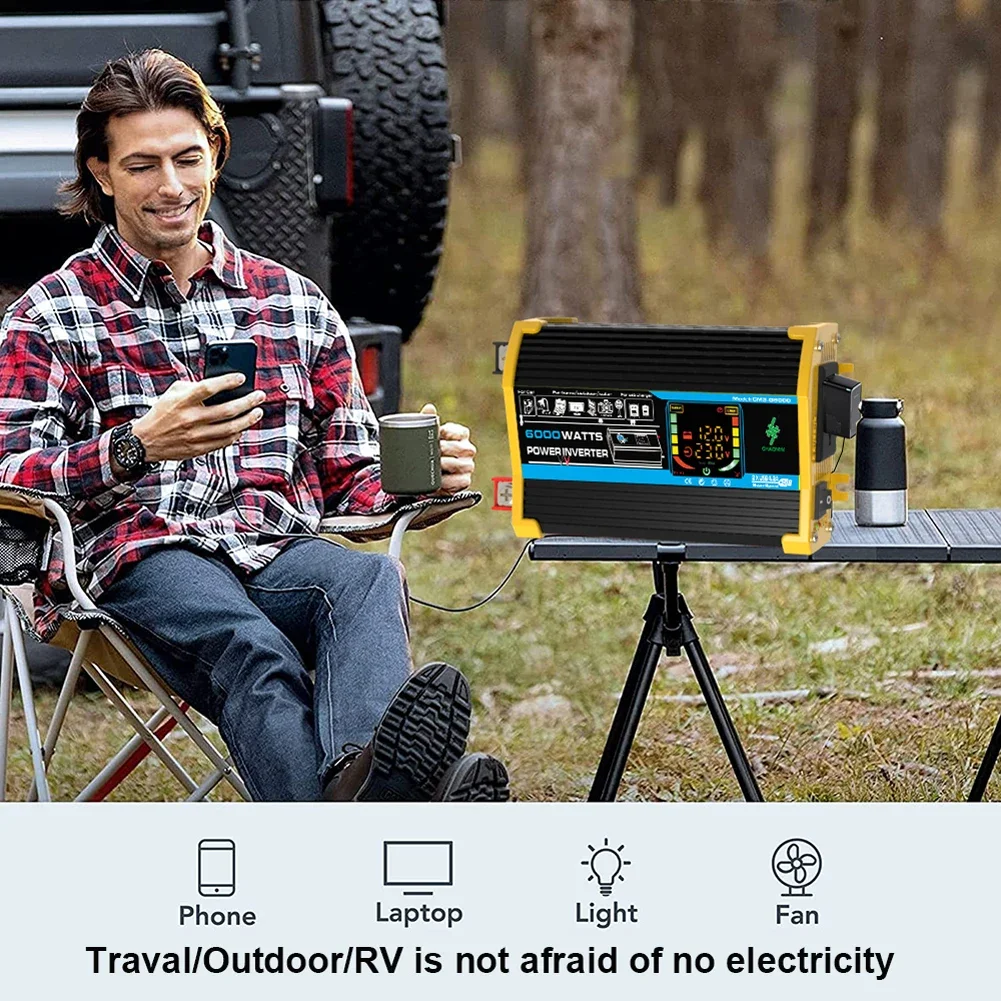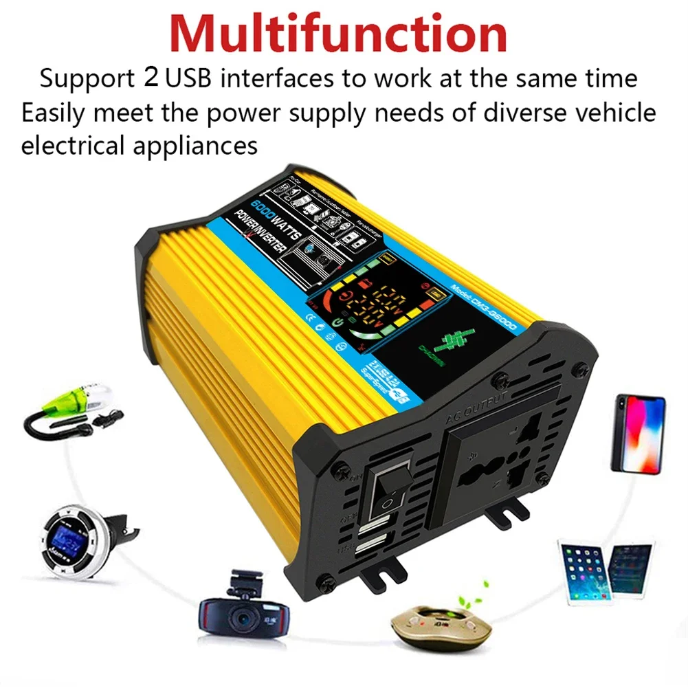 인증: 없음 원산지: 중국 본토 입력 전압: DC 12V(10.5V15V) 출력 전압 (옵션): AC 220V/220V 정격 전력: 500W 재질: 알루미늄 합금 + ABS 색상 (선택 사항): 검정/노랑 출력 주파수: 220V 50Hz / 110V 60Hz 피크 파워: 6000W 디스플레이: LCD 컬러 지능형 디스플레이 LCD 디스플레이: 입/출력 전압, 전력, 부하, 주파수, 보호 기능, 작동 상태 표시 등 듀얼 USB 인터페이스: 5V DC/2.1A 무부하 전류: ≤ 0.5A 보호 기능: 과부하, 과열, 고전압, 저전압, 역 연결, 단락, 지능형 온도 제어, 500W 미만의 기기에 사용 가능 (유도 부하 기기 및 제품 제외) 출력 파형: 수정된 사인파 크기: 200x100x78mm/7.9x3.9x3.1 인치 총 중량: 750g 참고:
