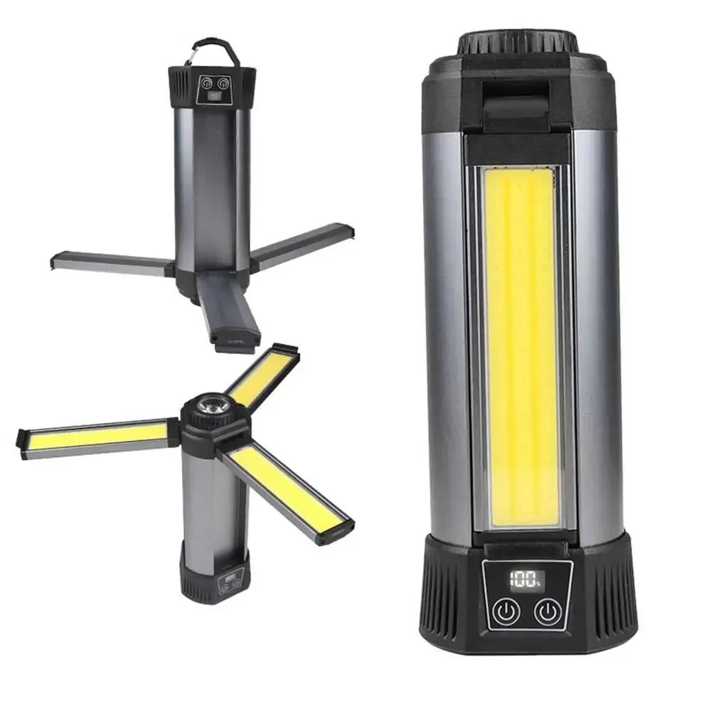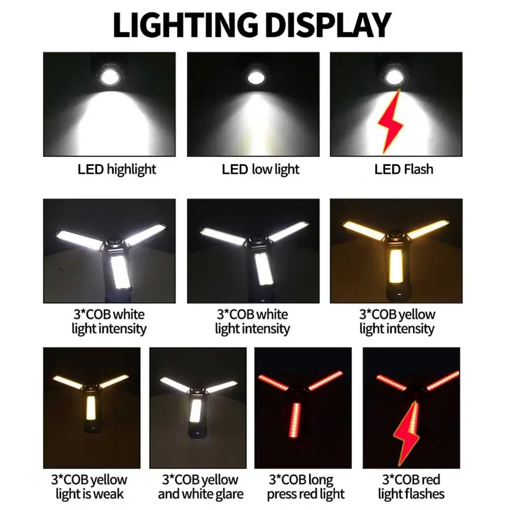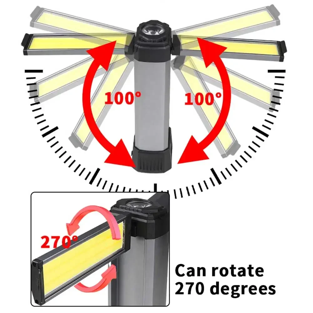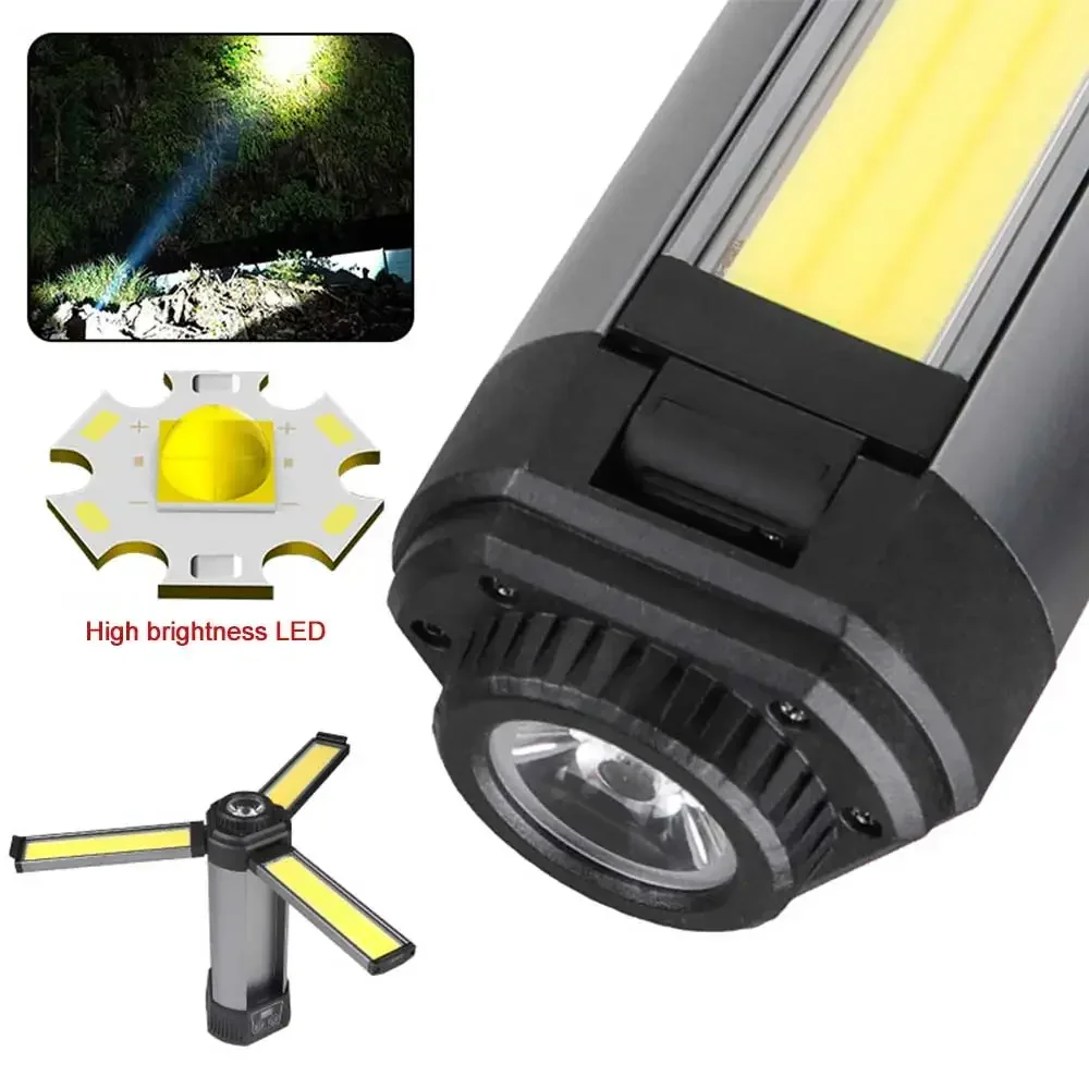 후크 포함, 자석 포함, 삼각대에 장착 가능, 브래킷 접이식 가능, 대형 표면 COB 투광 광원 3개,