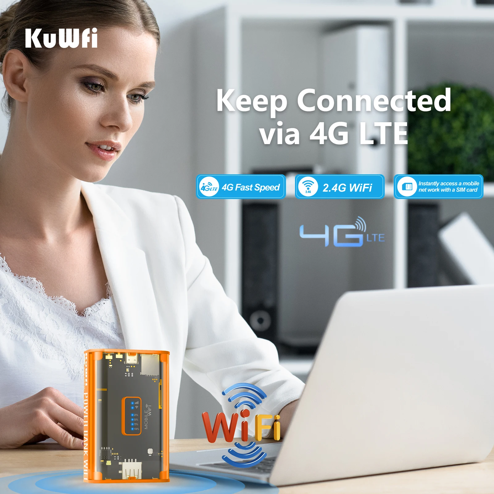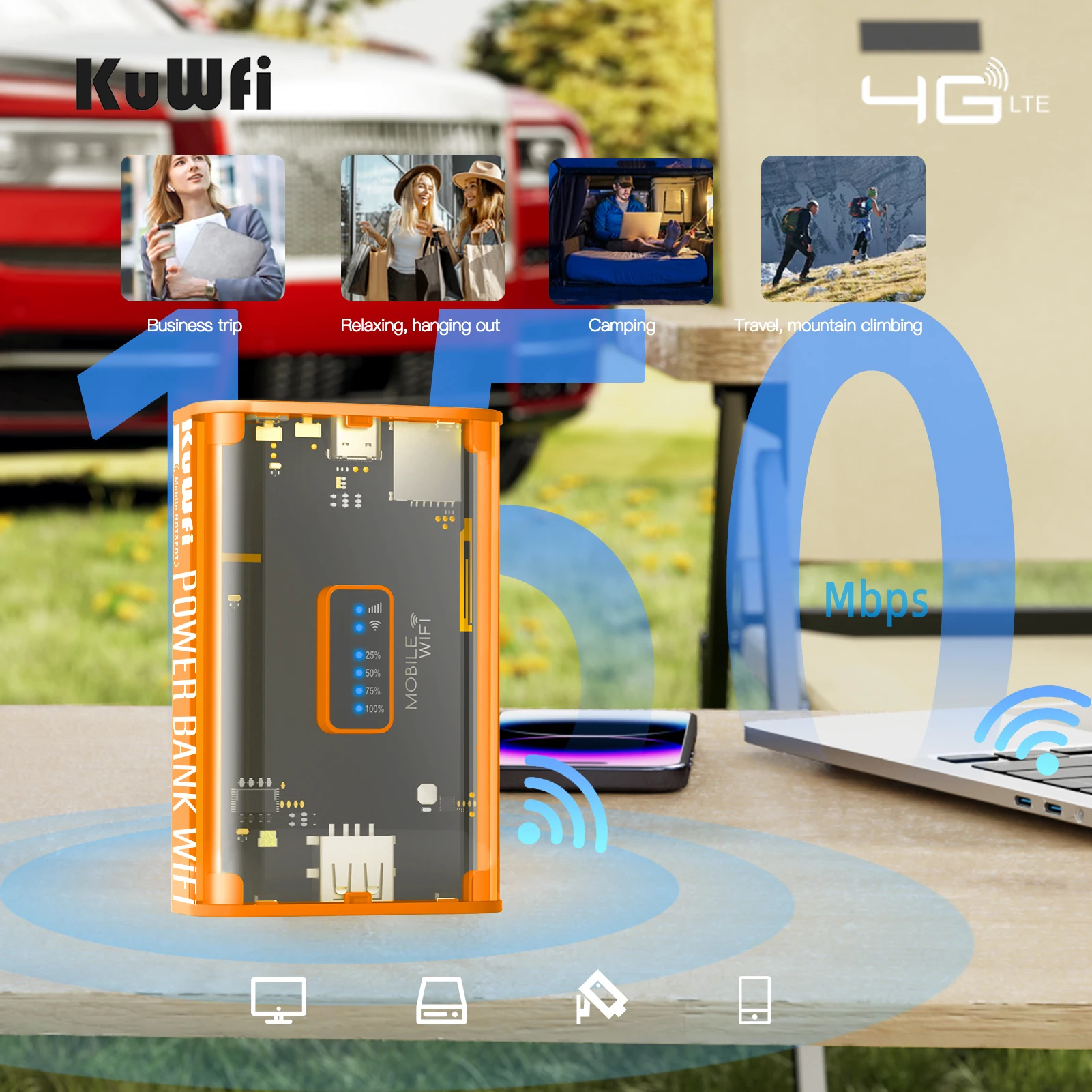 이미지: 카페 테이블에서 노트북 + 휴대폰 충전, "30시간 런타임"이 표시되는 라우터