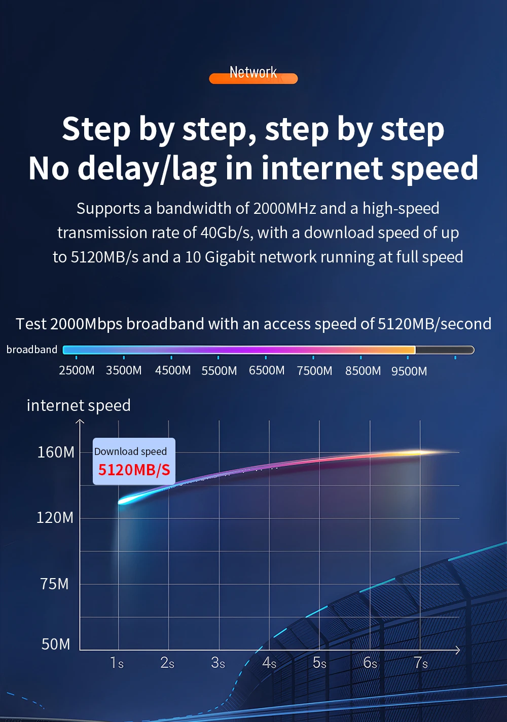 3.단계별, 단계별 지연/인터넷 속도 지연 없음 2000MHZ의 대역폭과 40GB/s의 고속 전송 속도를 지원하며 최대 5120MB/s의 다운로드 속도와 최대 속도로 실행되는 10기가비트 네트워크를 지원합니다.