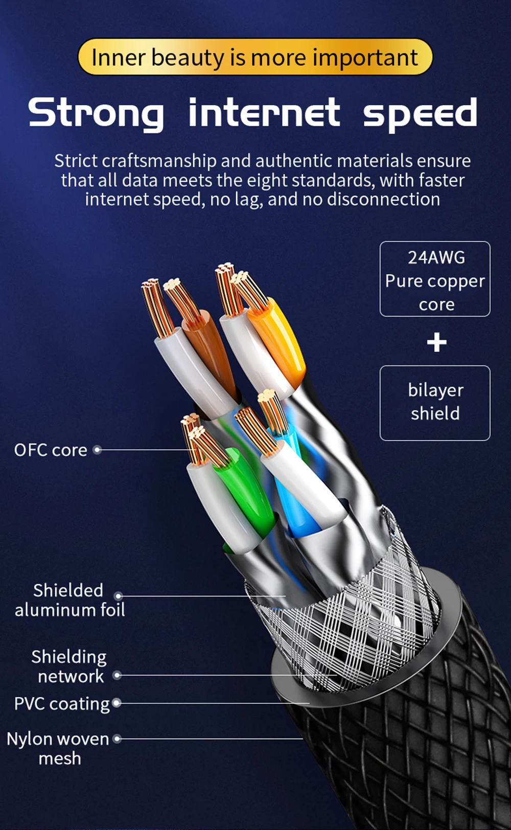 엄격한 장인정신과 정통 재료를 통해 모든 데이터가 8가지 표준을 충족하고 인터넷 속도가 더 빠르고 지연이 없으며 연결 끊김이 없음을 보장합니다.