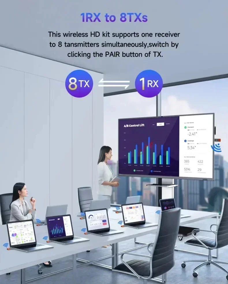 【다대일 모드】8개의 송신기를 1개의 수신기에 동시에 연결할 수 있으며, 원클릭 스위치로 서로 간섭하지 않으며 여러 화면을 공유할 수 있습니다.*참고: 이 작업을 수행하려면 송신기를 추가로 구매해야 하며, 수신기 1개는 최대 8개의 송신기를 지원할 수 있습니다.