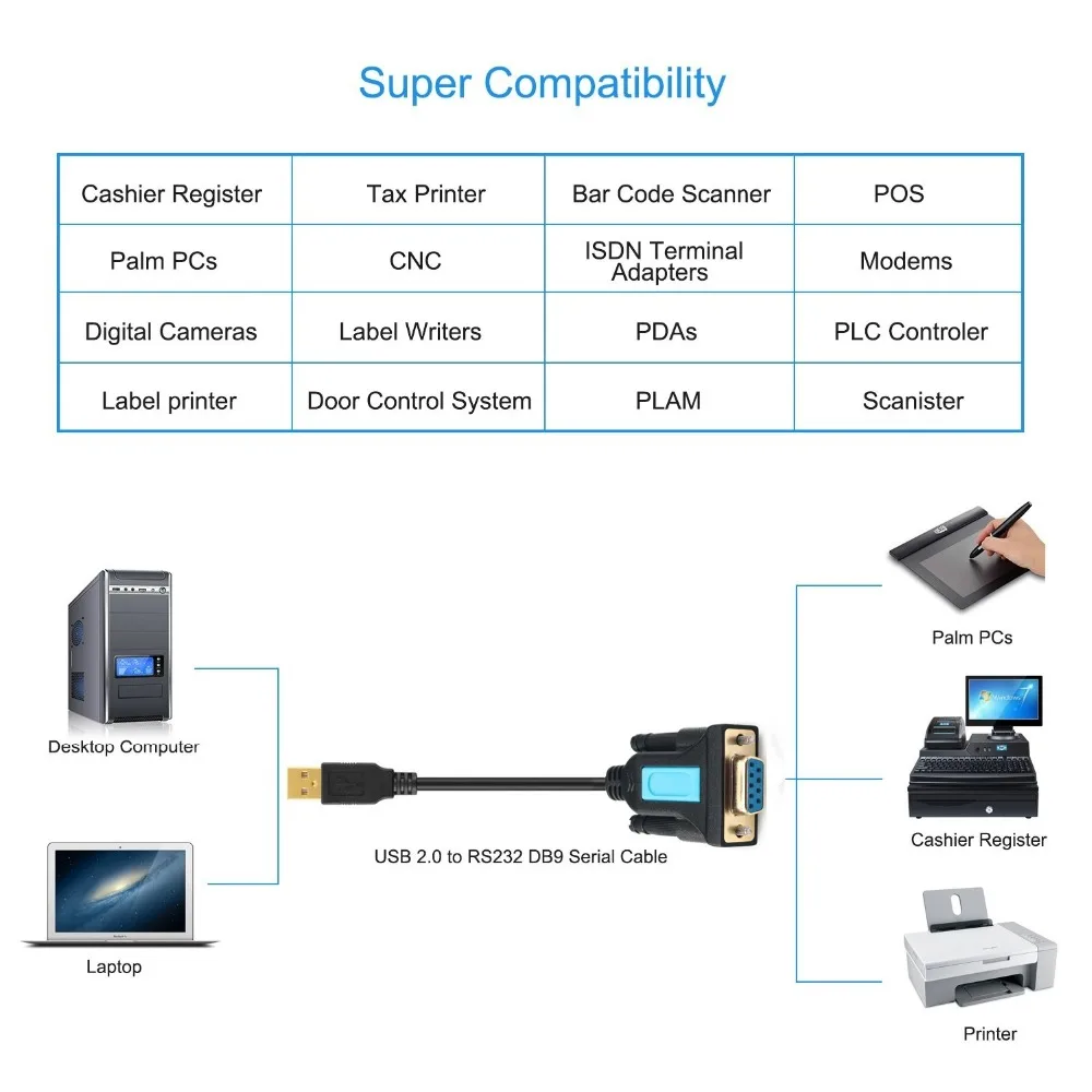 USBRS232 DB9 직렬 어댑터는 1Mbps 데이터 전송 속도의 USB 포트를 통해 DB9 장착 직렬 모뎀, ISDN 터미널 어댑터, 디지털 카메라, 라벨 라이터, 팜 PC, 바코드 스캐너, PDA 등과 같은 직렬 장치에 연결하도록 설계되었습니다.