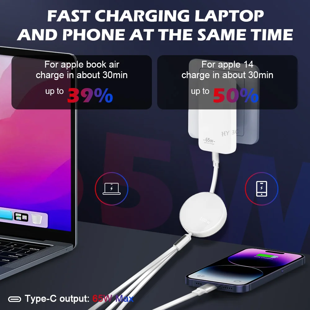 기존 벽면 충전기보다 3 배 빠릅니다. 고속 충전 노트북과 전화를 동시에 제공합니다. 사과 책 공기 충전의 경우 약 30 분 최대 39%, 사과 14 의 경우 약 30 분 최대 50% 충전합니다.