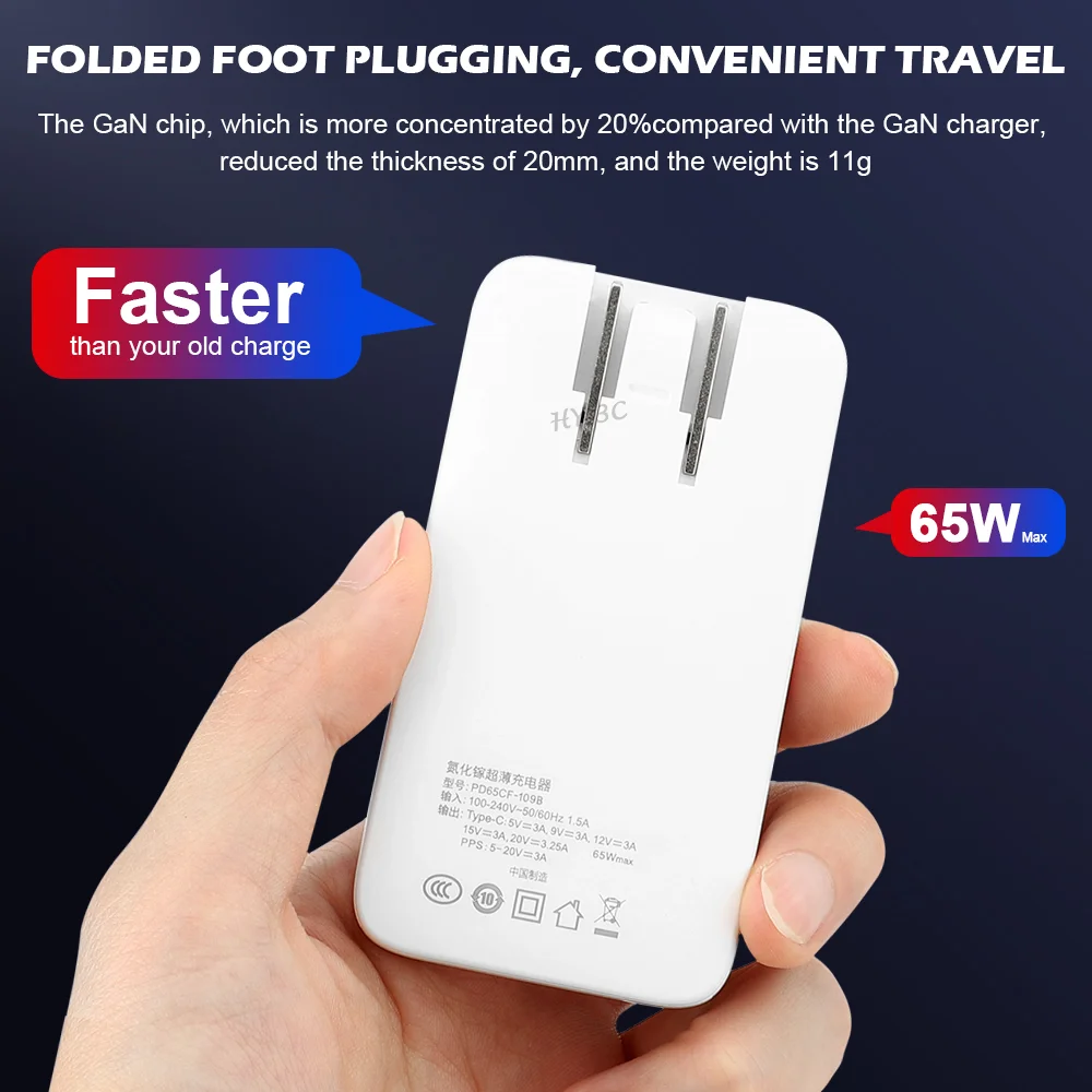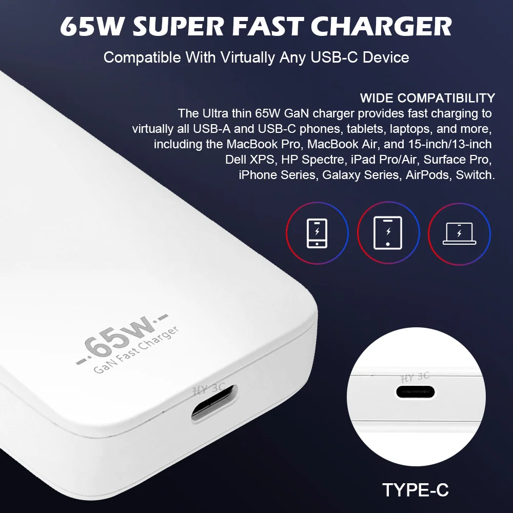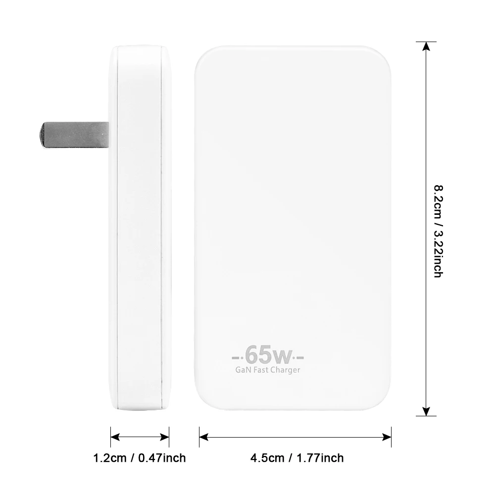 초박형 65W GaN 충전기는 거의 모든 USBA 및 USBC 휴대폰, 태블릿, 노트북 등에 고속 충전을 제공합니다.
