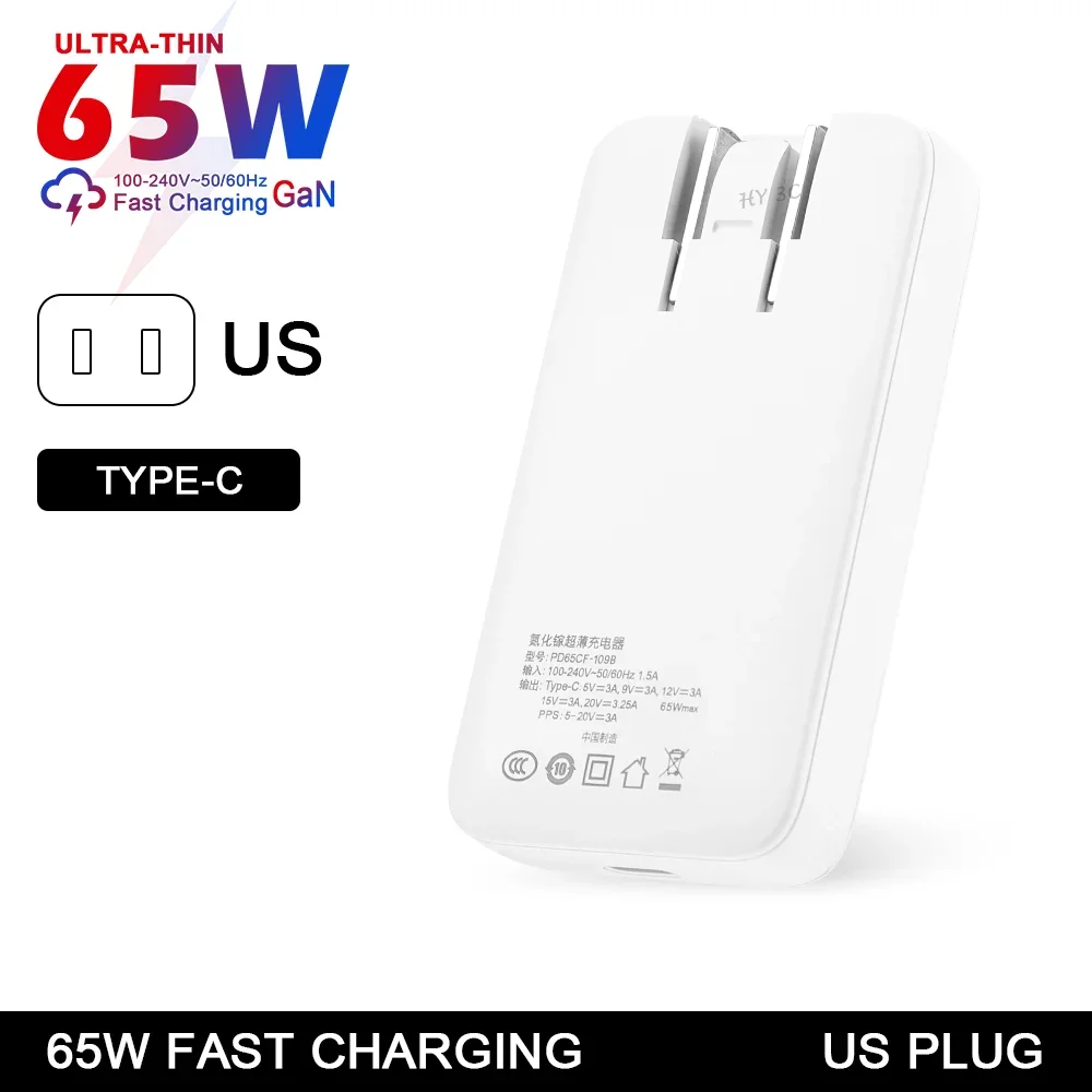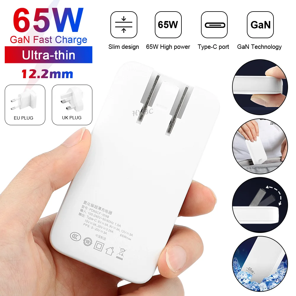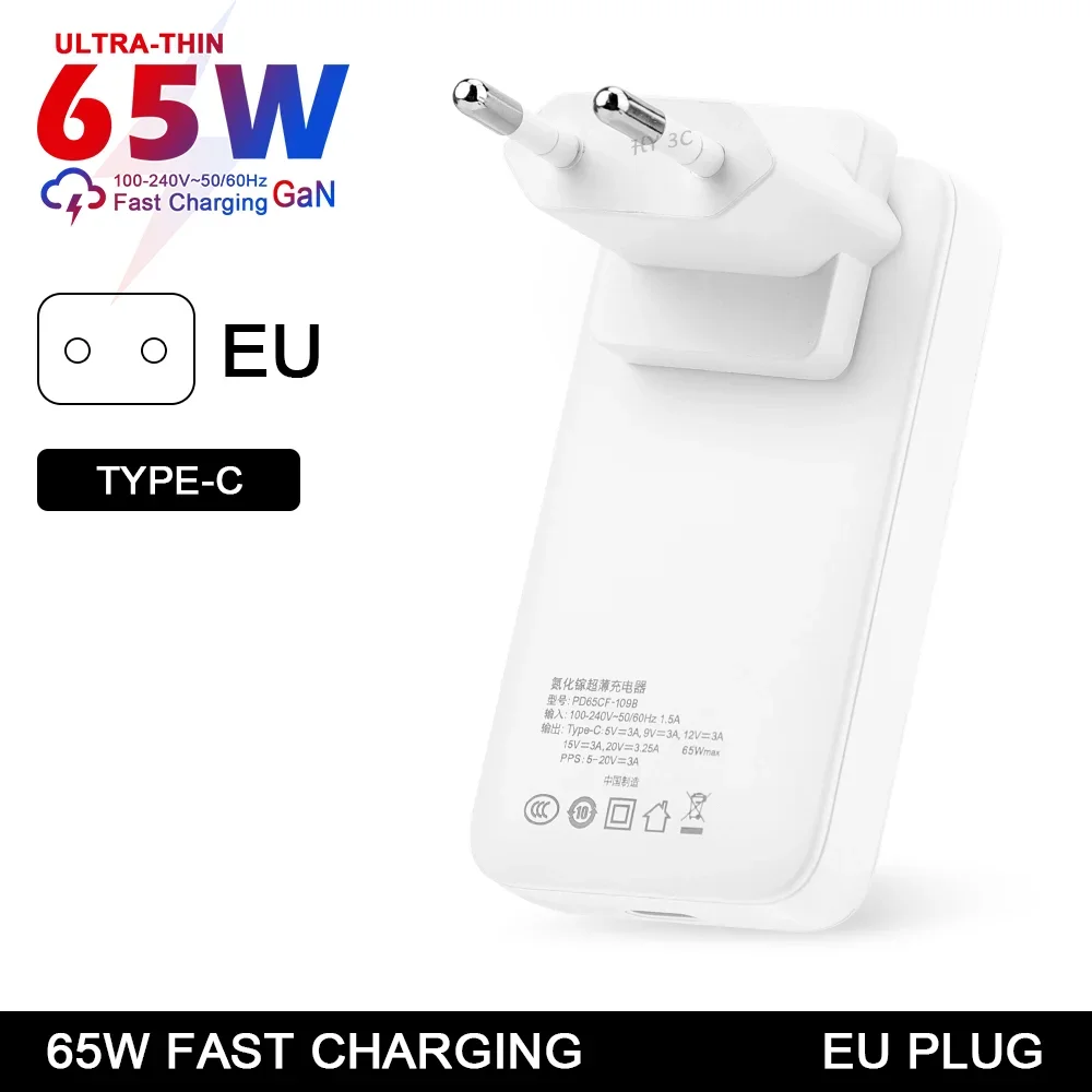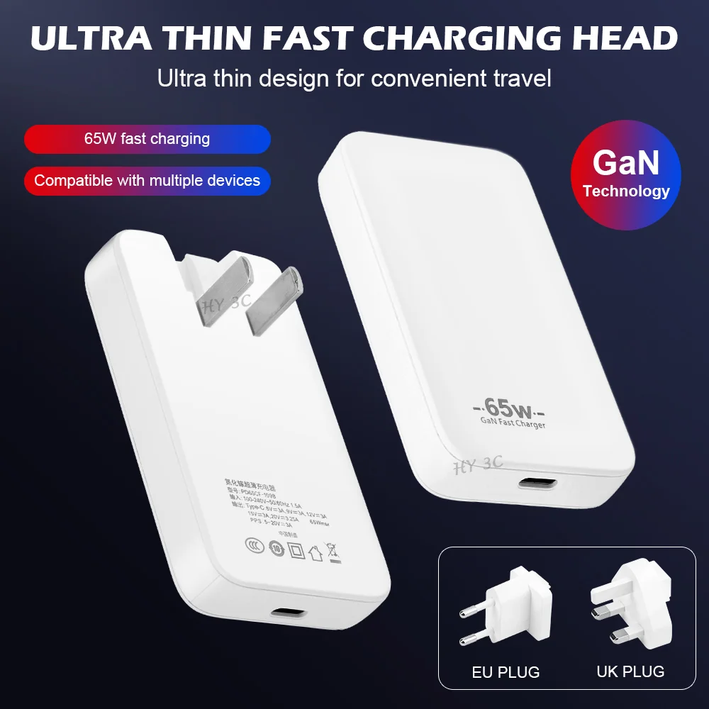 GaN 65W 초박형 EU/미국/영국 PLUG USB C 빠른 충전 PD 고속 충전 변환 플러그 전화 노트북을위한 국제 여행