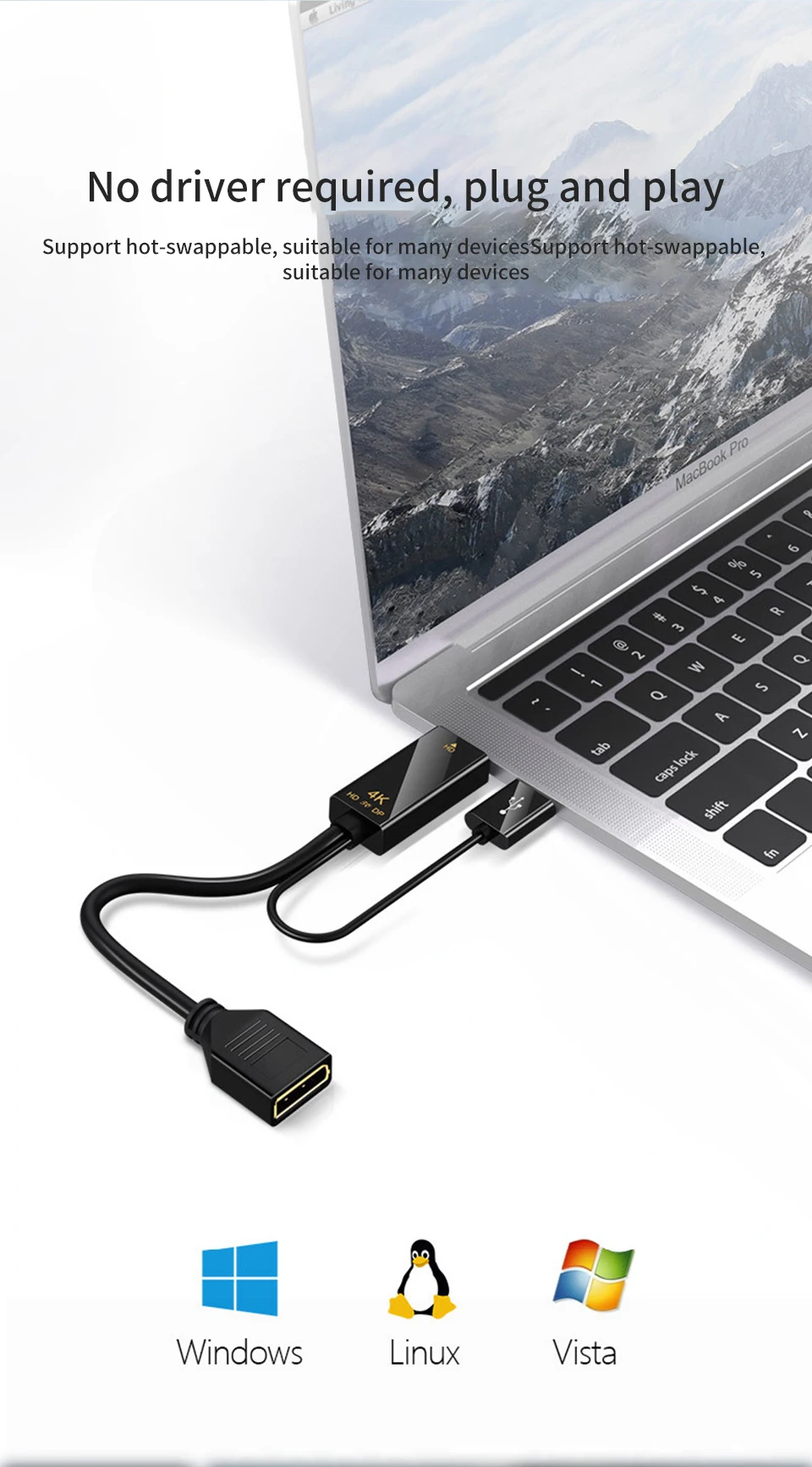 【두 가지 디스플레이 모드】 컴팩트 어댑터에는 두 가지 디스플레이 모드가 있습니다. 모니터 디스플레이: HD 입력 소스와 DP 모니터가 동일한 사진을 재생합니다.확장 모드: DP 모니터가 HD 입력의 영화를 재생할 때 입력 소스 컴퓨터에서 인터넷 서핑을 할 수 있습니다.