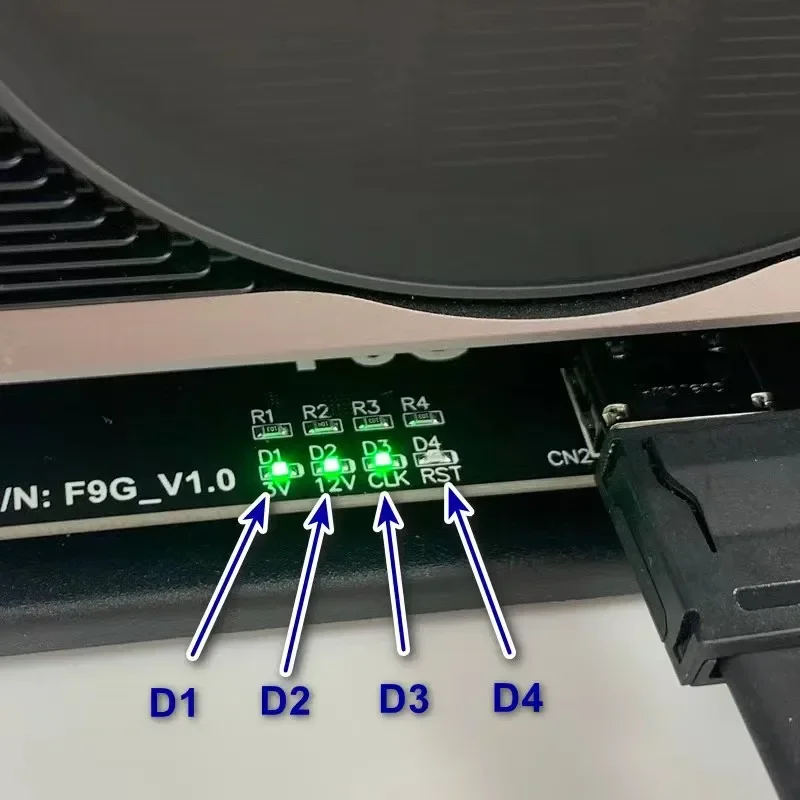 이 장치는 D1이 케이블 감지를 나타내는 조명일 뿐입니다.D2는 도크의 POWER LOGIC 공급 상태를 나타냅니다. 도크의 시작을 표시하기 위해 표시등이 켜져 있습니다.일부 AMD 카드를 사용할 때 D3가 켜지지 않습니다.D4는 켜고 끌 때 깜박입니다.