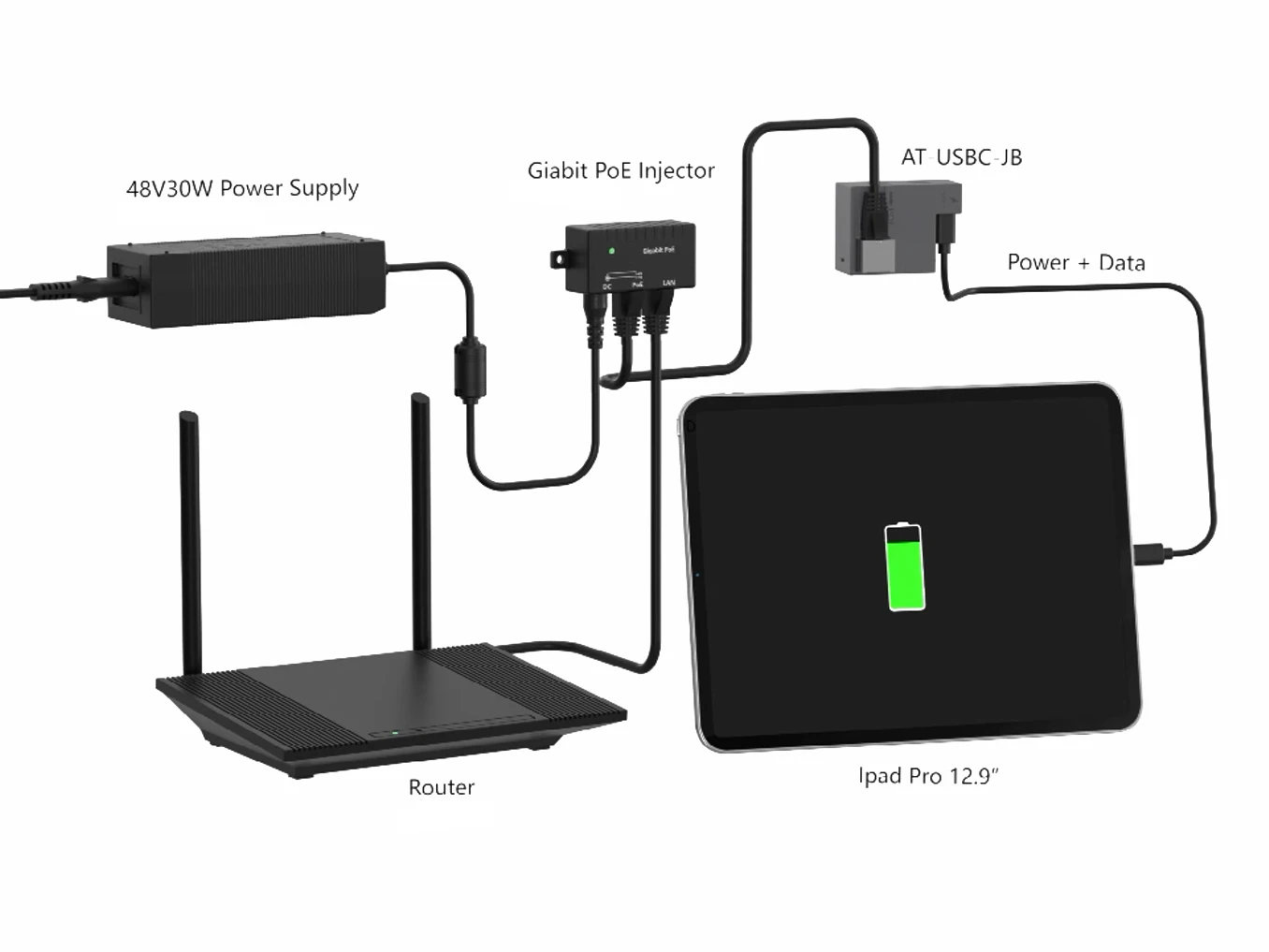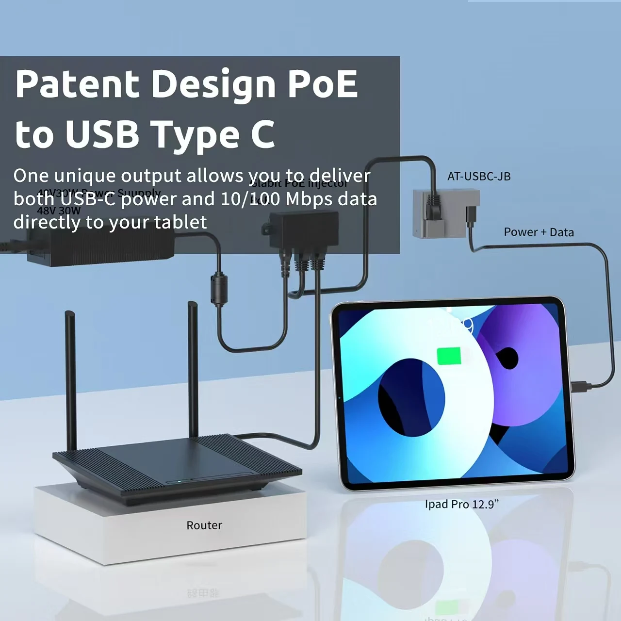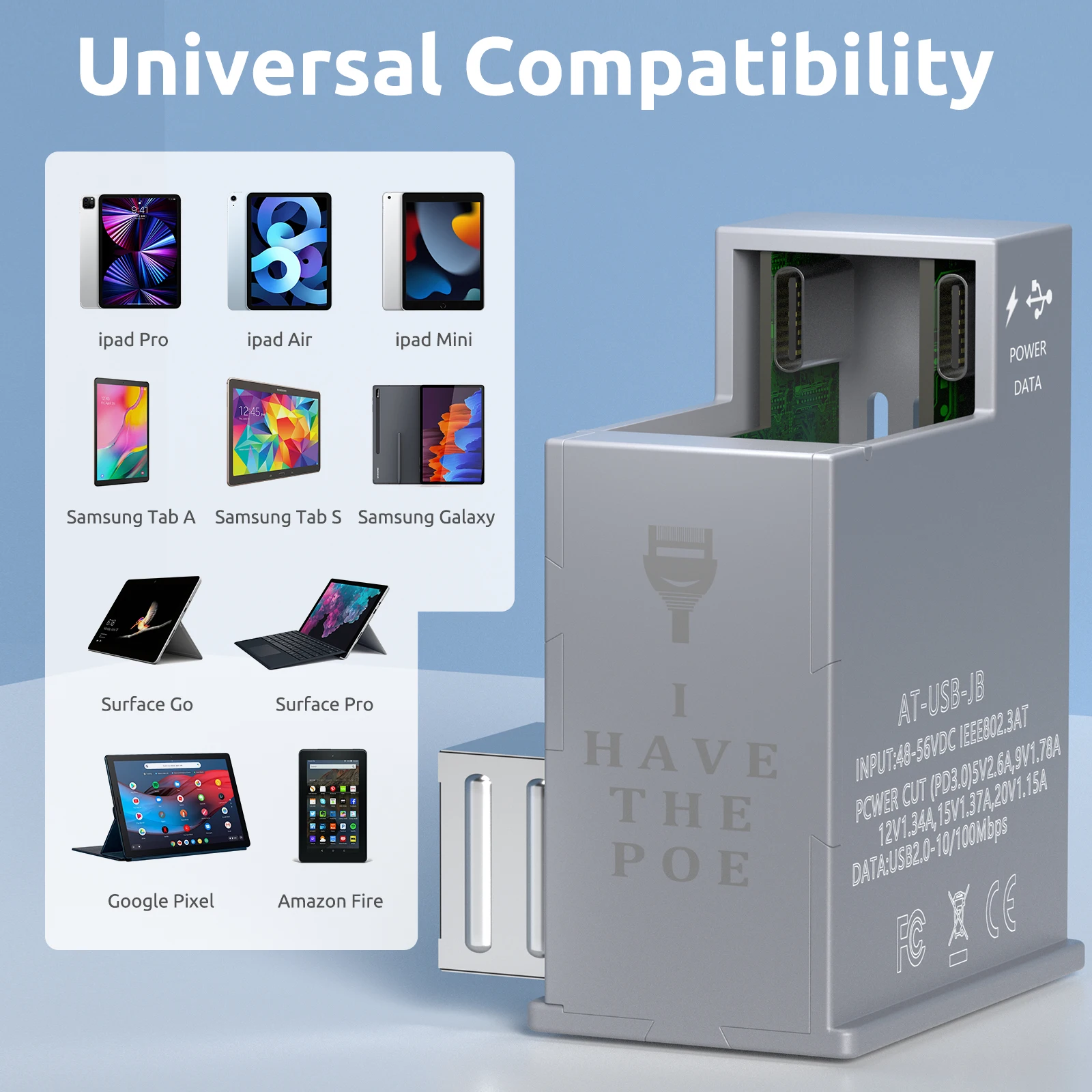 이 802.3at PoE 호환 어댑터는 25W POWER LOGIC 출력을 제공하는 동시에 태블릿에 USBC POWER LOGIC 및 데이터 연결을 제공합니다.