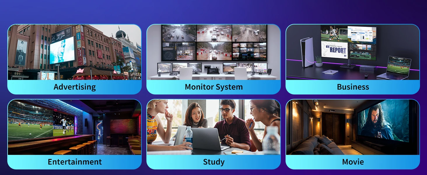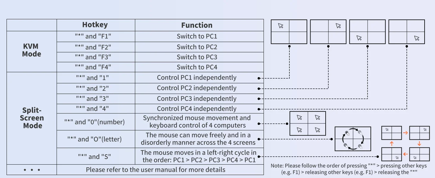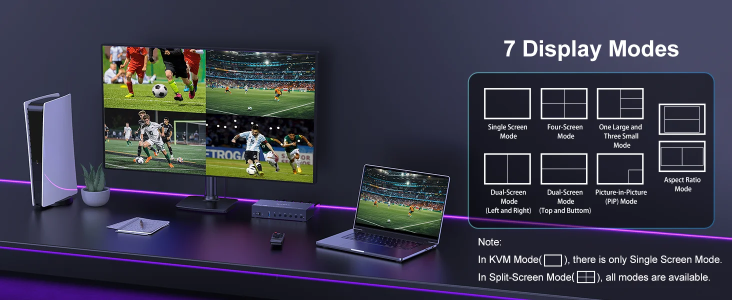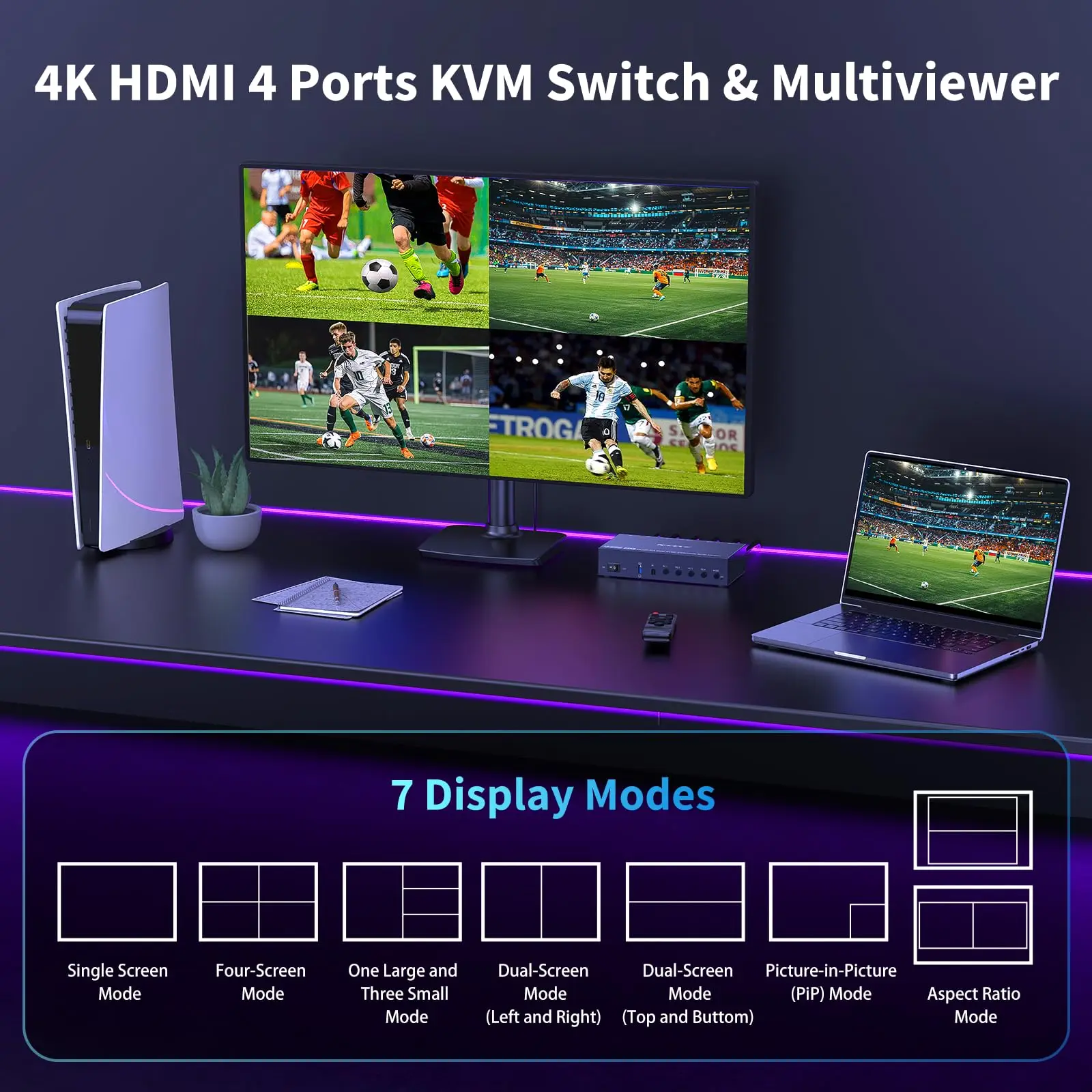 【7가지 스마트 디스플레이 모드】KVM 모드/분할 화면 모드를 즉시 전환합니다.KVM 스위치 HDMI에는 단일 화면/4화면/대형 1개 및 소형 3개/PIP/왼쪽 및 오른쪽/상단 및 하단/가로 비율 등 총 7가지 레이아웃이 포함되어 있습니다.