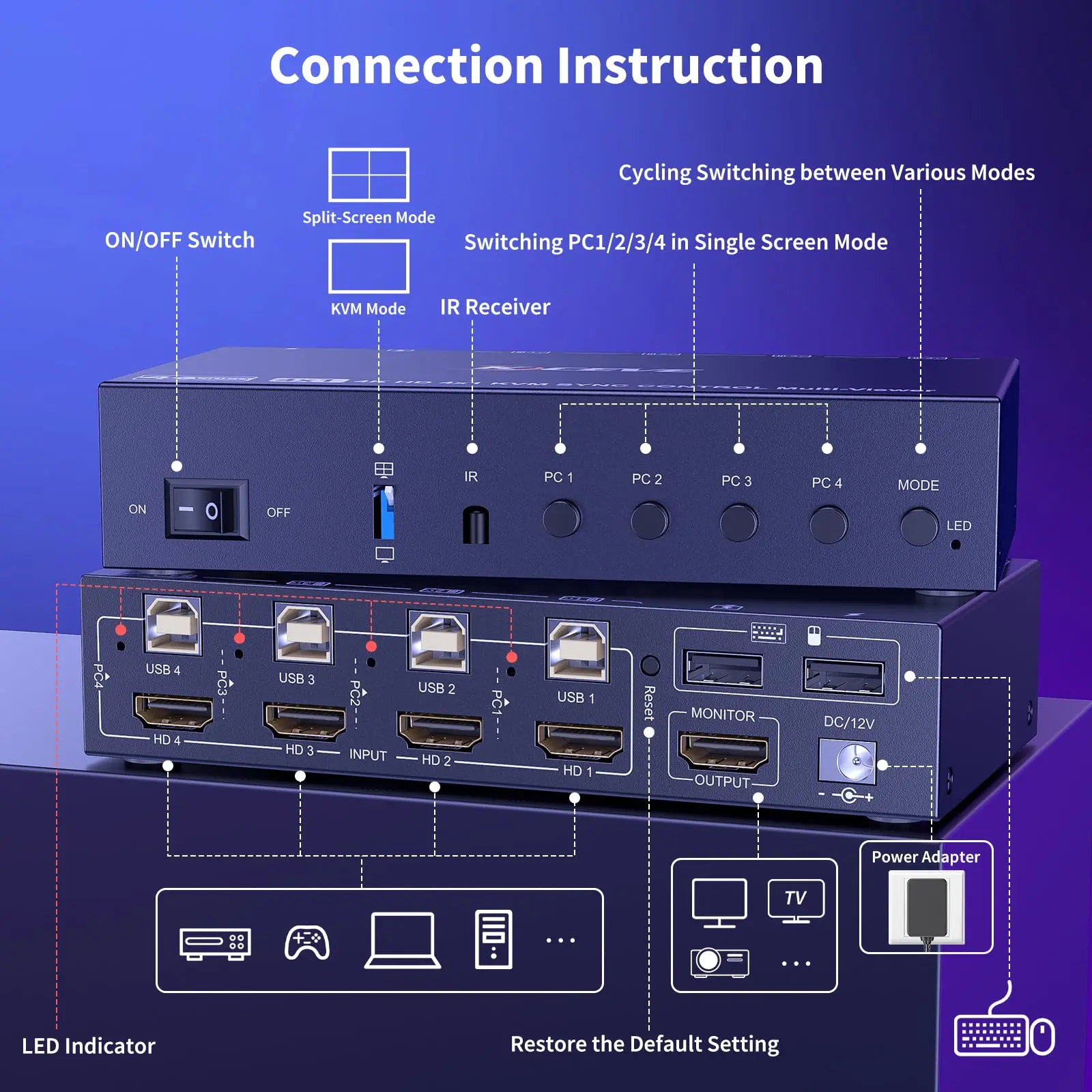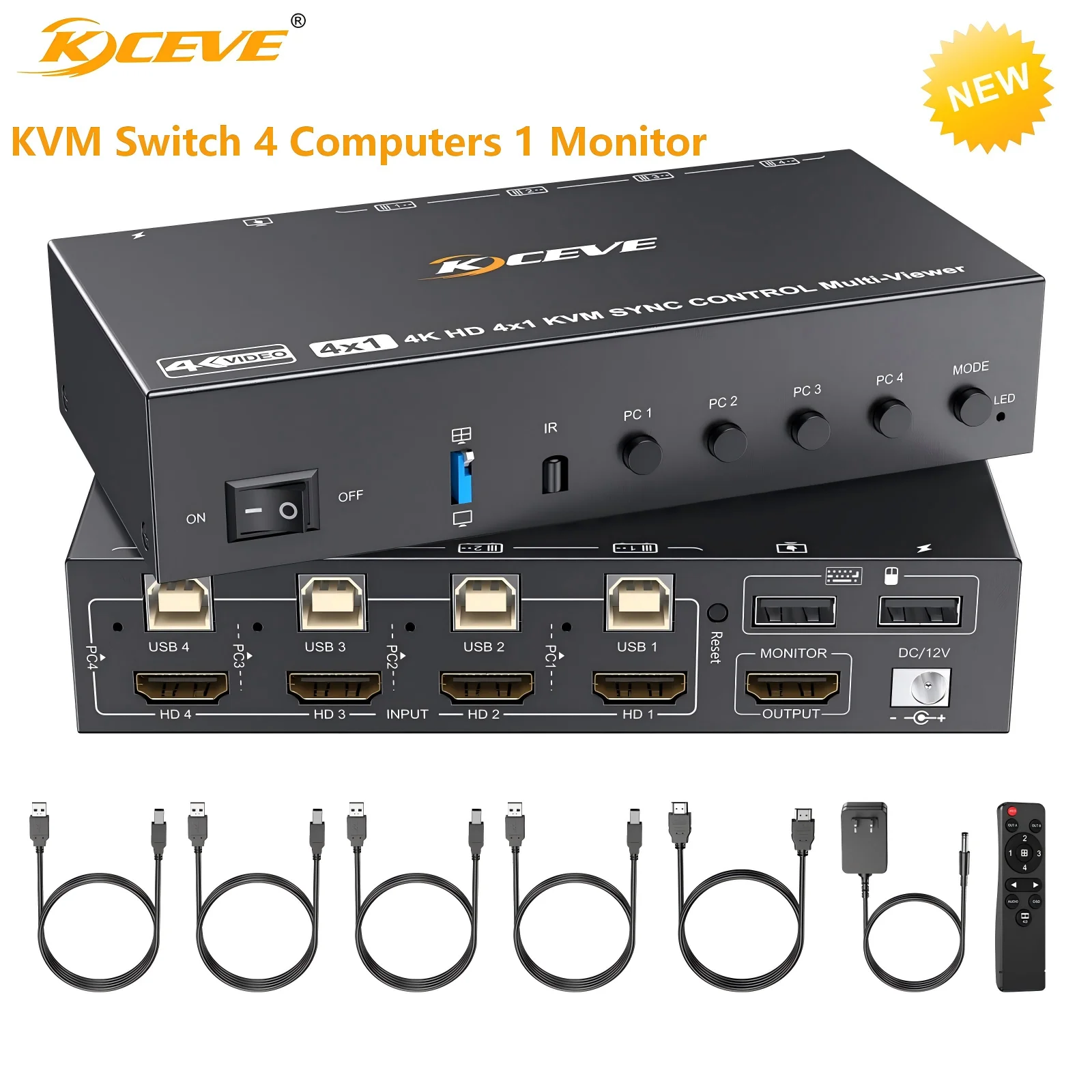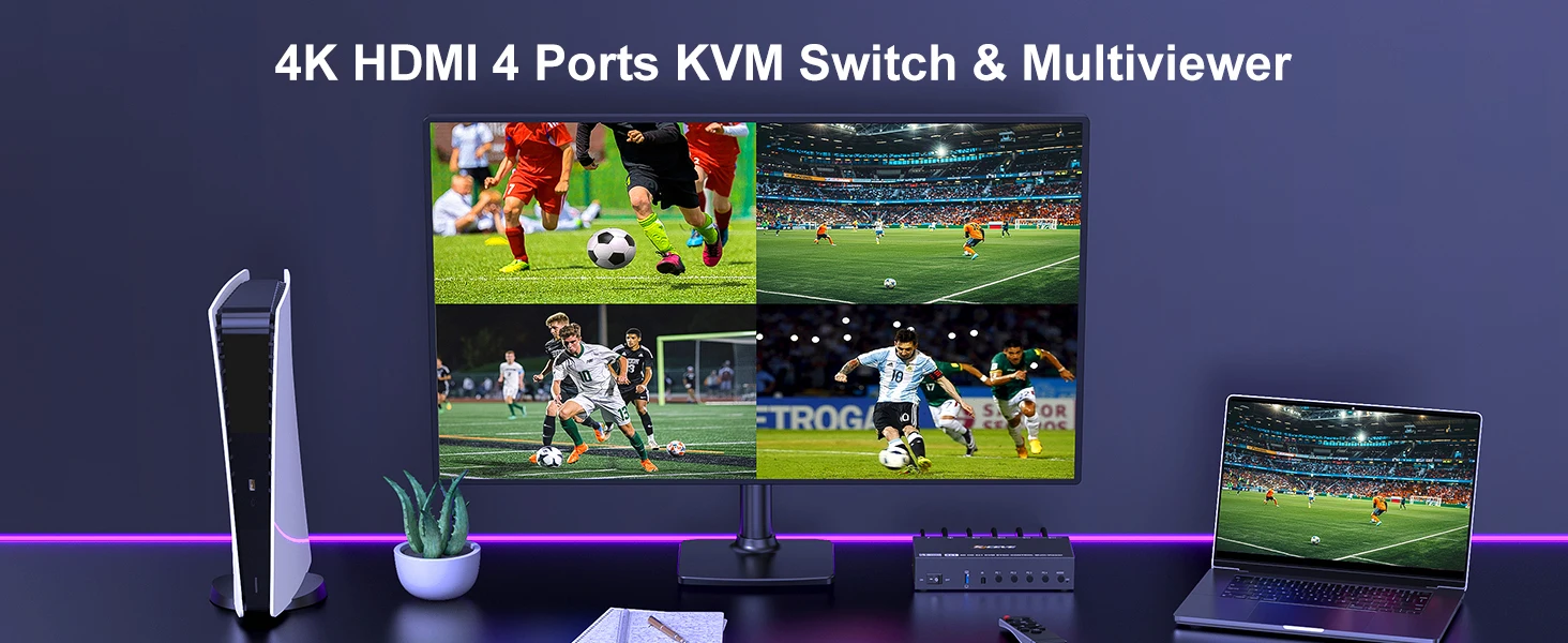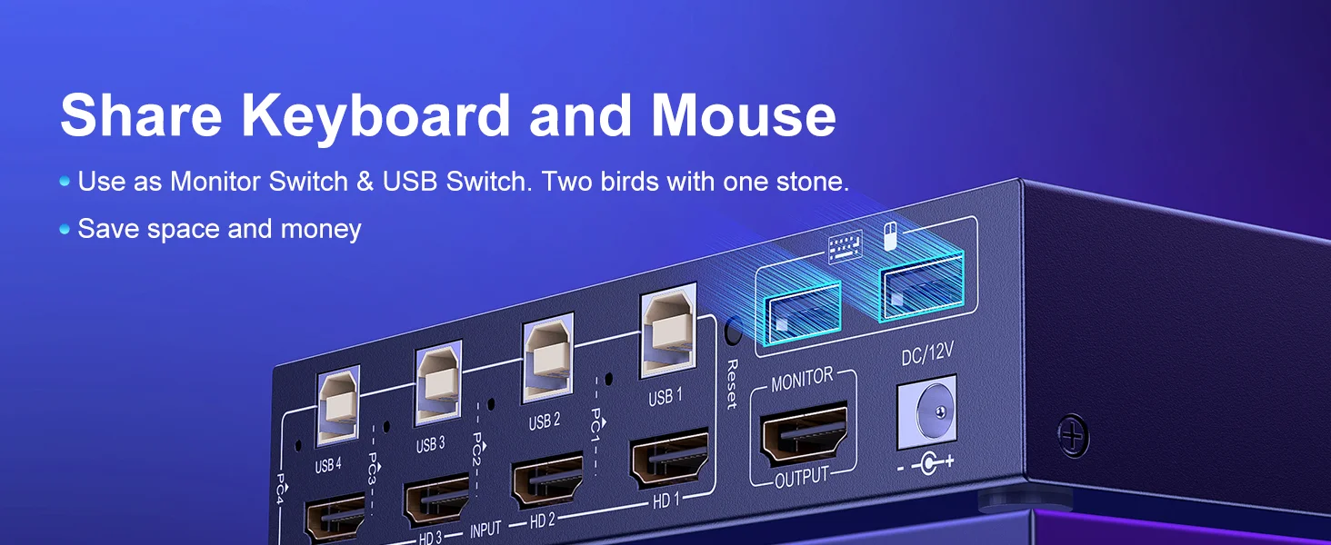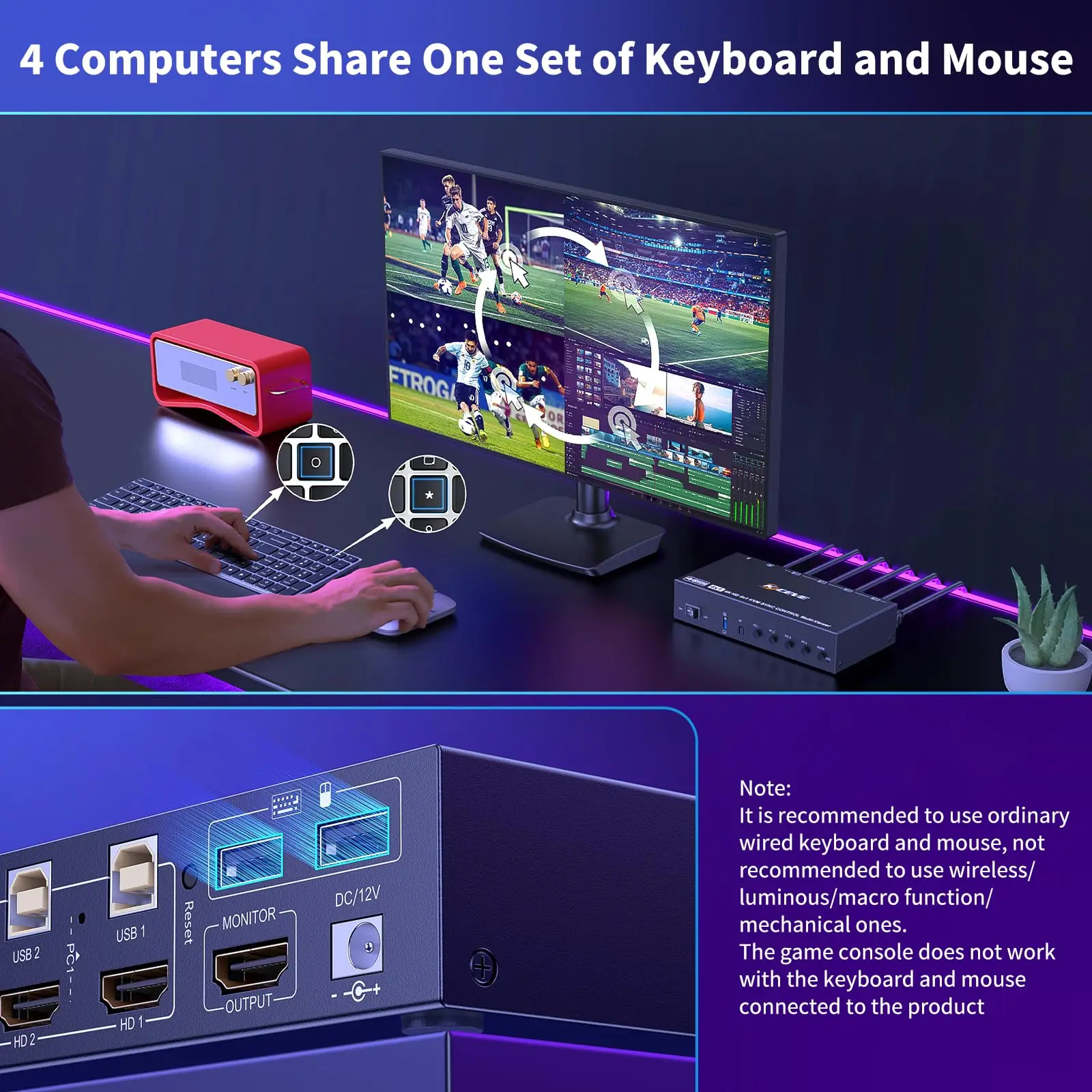 【HDMI KVM 스위치 및 멀티뷰어】이 GLOBE MOTORS 설정을 통해 4대의 컴퓨터가 하나의 키보드/마우스로 하나의 모니터를 공유할 수 있습니다.USB KVM 스위치에 여러 레이아웃을 추가하고 USB를 HDMI 멀티뷰어에 공유하면 시간, 공간 및 비용이 절약됩니다.