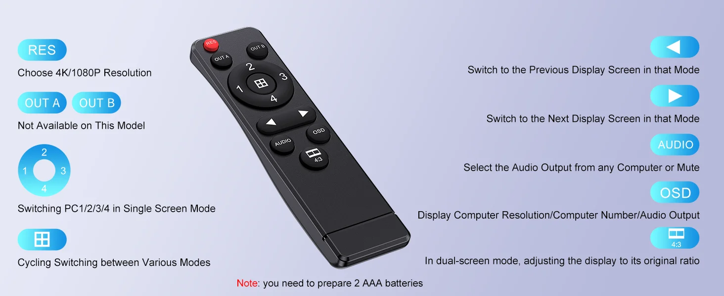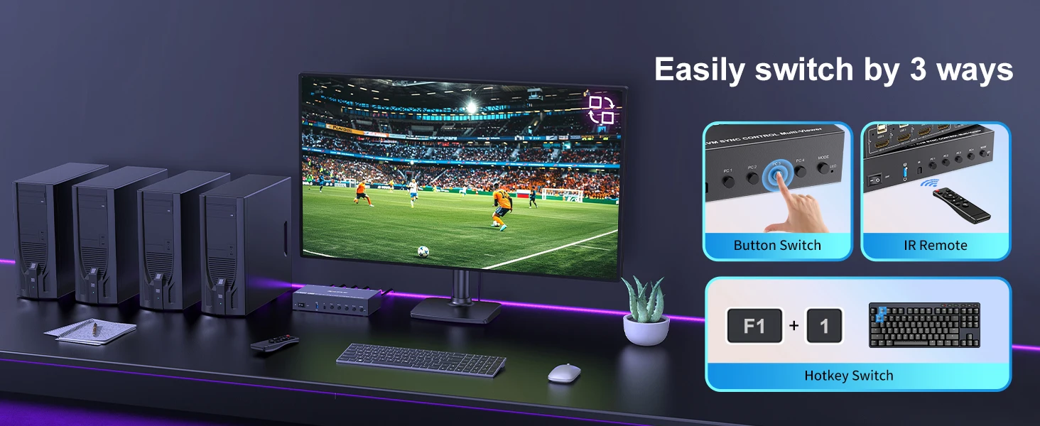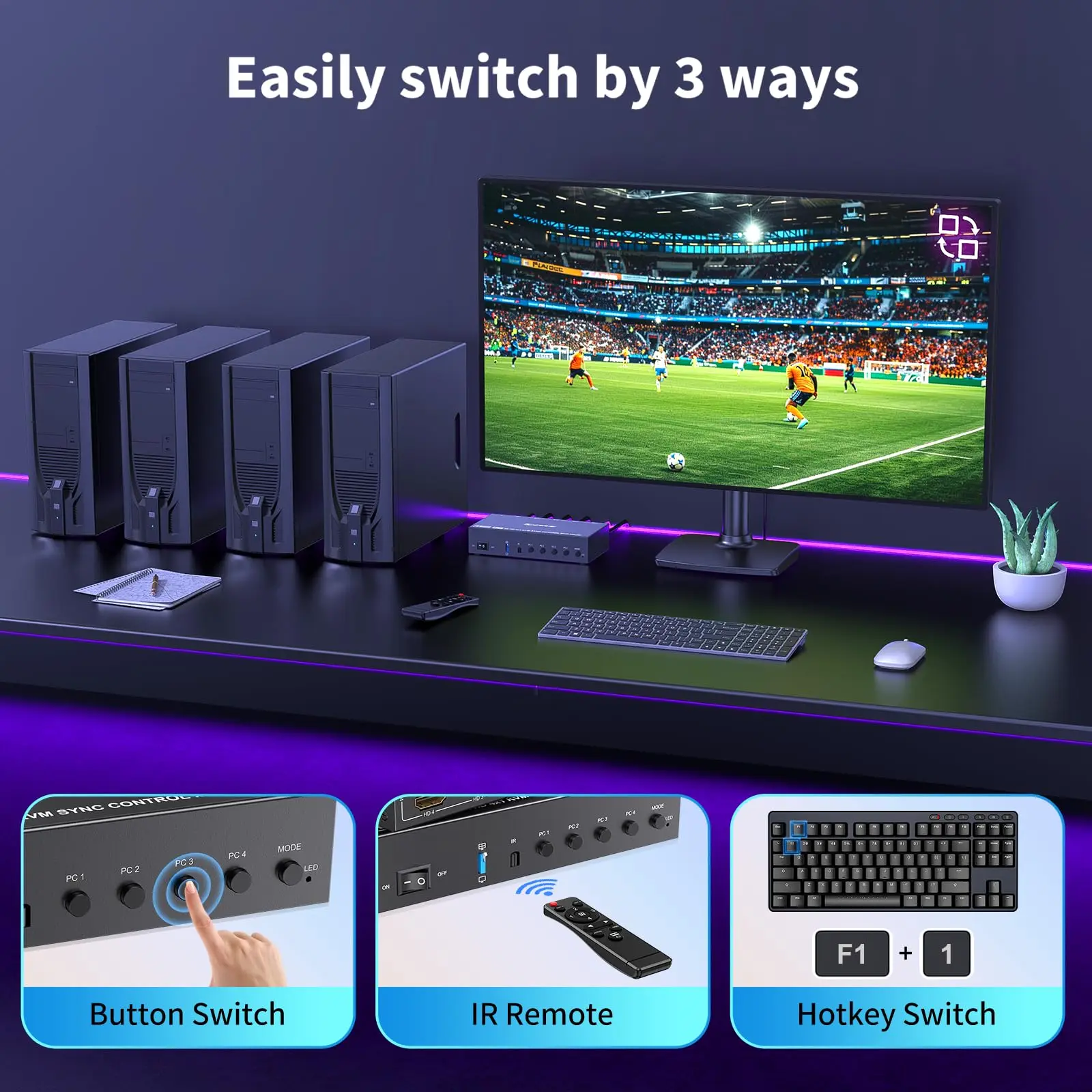 【3가지 방법으로 원활한 전환】컴퓨터 간의 진정한 지연 없는 전환을 경험해 보세요.손쉬운 전환: 장치 버튼, 단축키 또는 IR 리모컨(AAA 배터리는 포함되어 있지 않음).마음에 드는 방식을 자유롭게 선택하세요.
