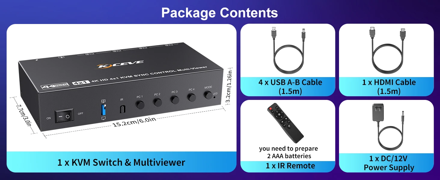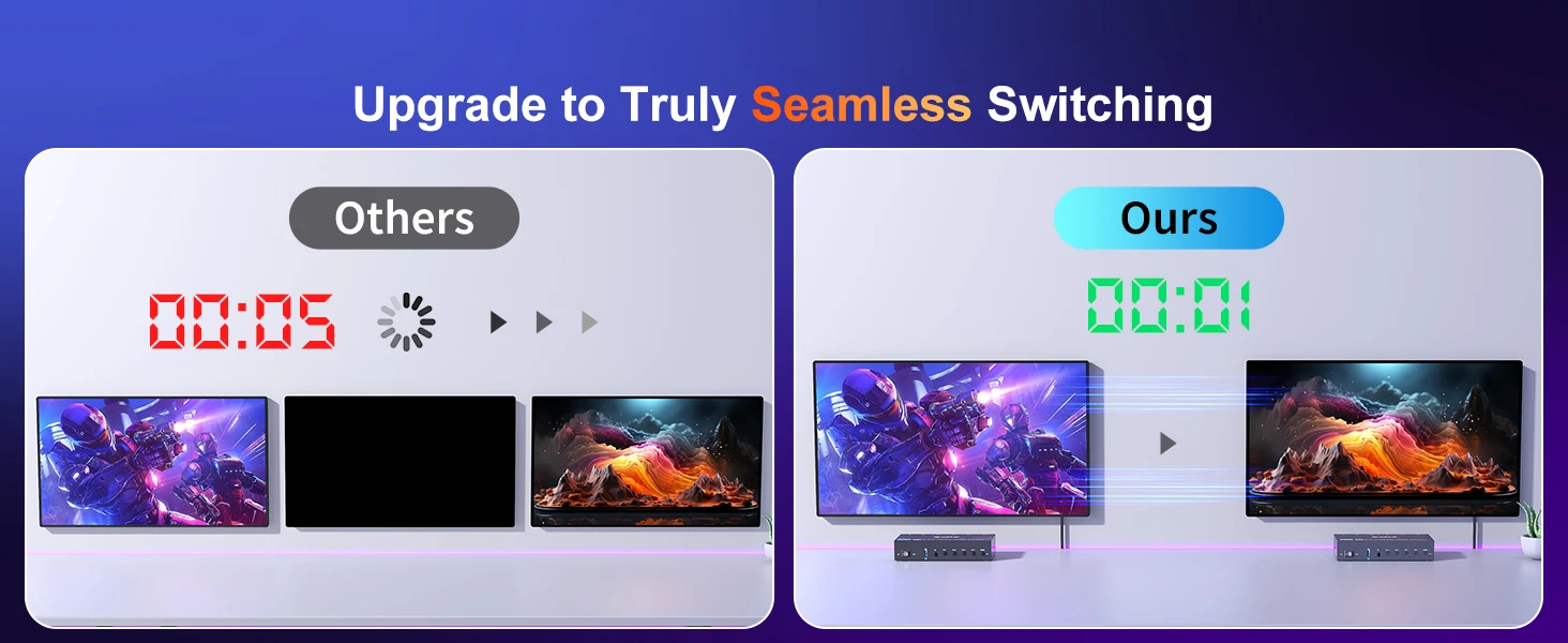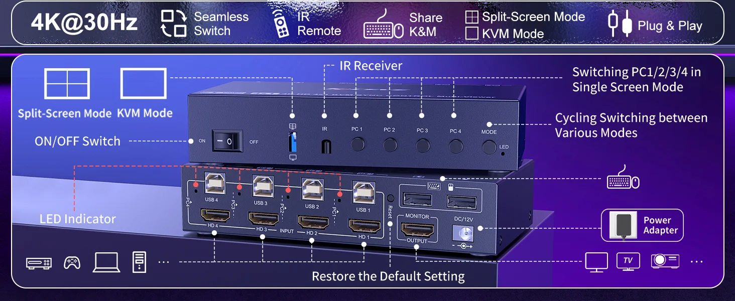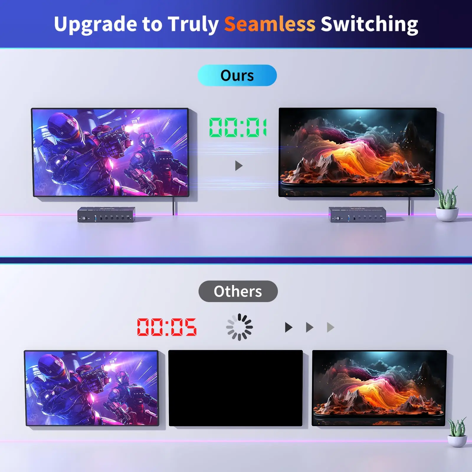 【3가지 방법으로 원활한 전환】컴퓨터 간의 진정한 지연 없는 전환을 경험해 보세요.손쉬운 전환: 장치 버튼, 단축키 또는 IR 리모컨(AAA 배터리는 포함되어 있지 않음).마음에 드는 방식을 자유롭게 선택하세요.