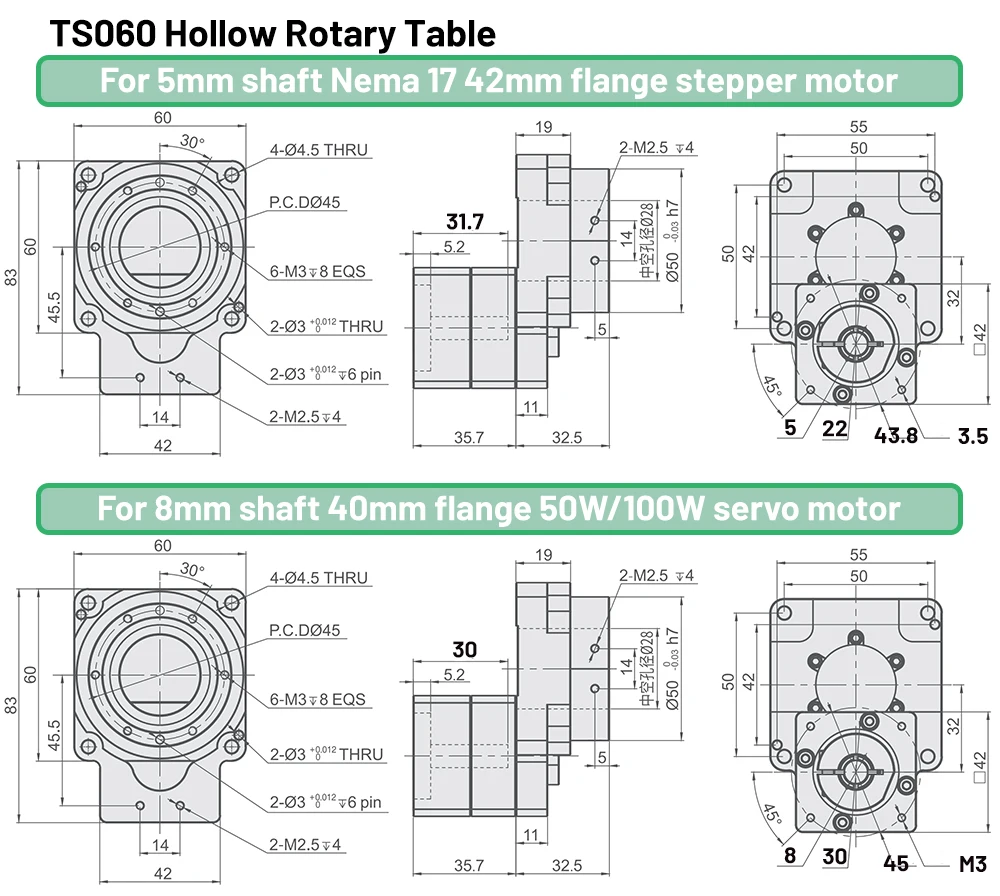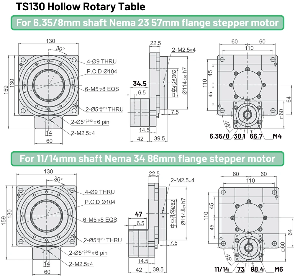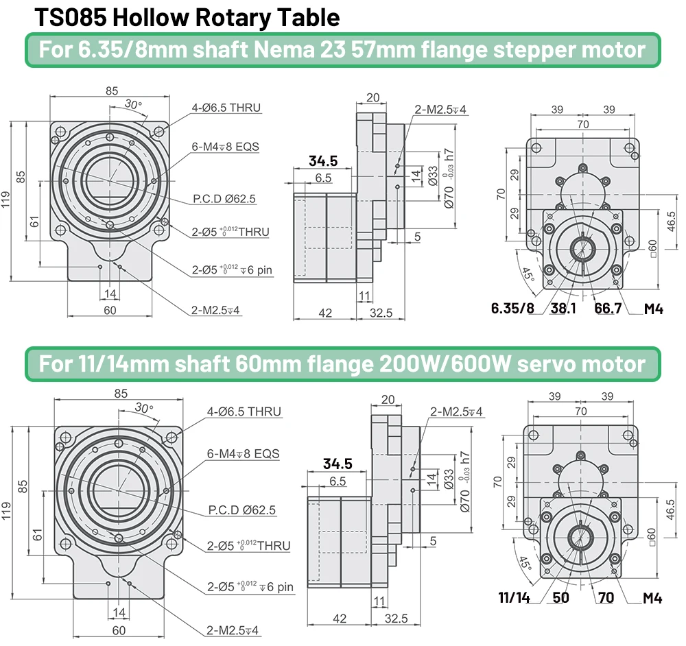 | 스테퍼 모터에 적응 | 5mm 샤프트 Nema17 스테퍼 | 6.35/8/9.525mm 샤프트 Nema23 스테퍼 | 6.35/8/9.525mm 샤프트 Nema23 스테퍼 ; 12.7/14mm 샤프트 Nema34 스테퍼 | 6.35/8/9.525mm 샤프트 Nema23 스테퍼 ; 12.7/14mm 샤프트 Nema34 스테퍼 | 12.7/14mm 샤프트 Nema34 스테퍼 | 19mm 샤프트 3PH Nema42 스테퍼 | ||||||