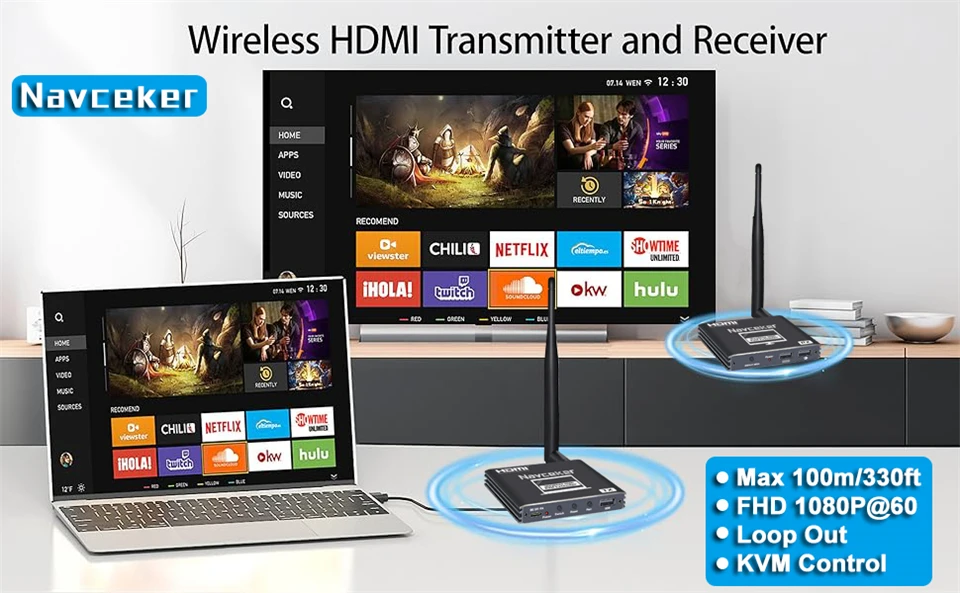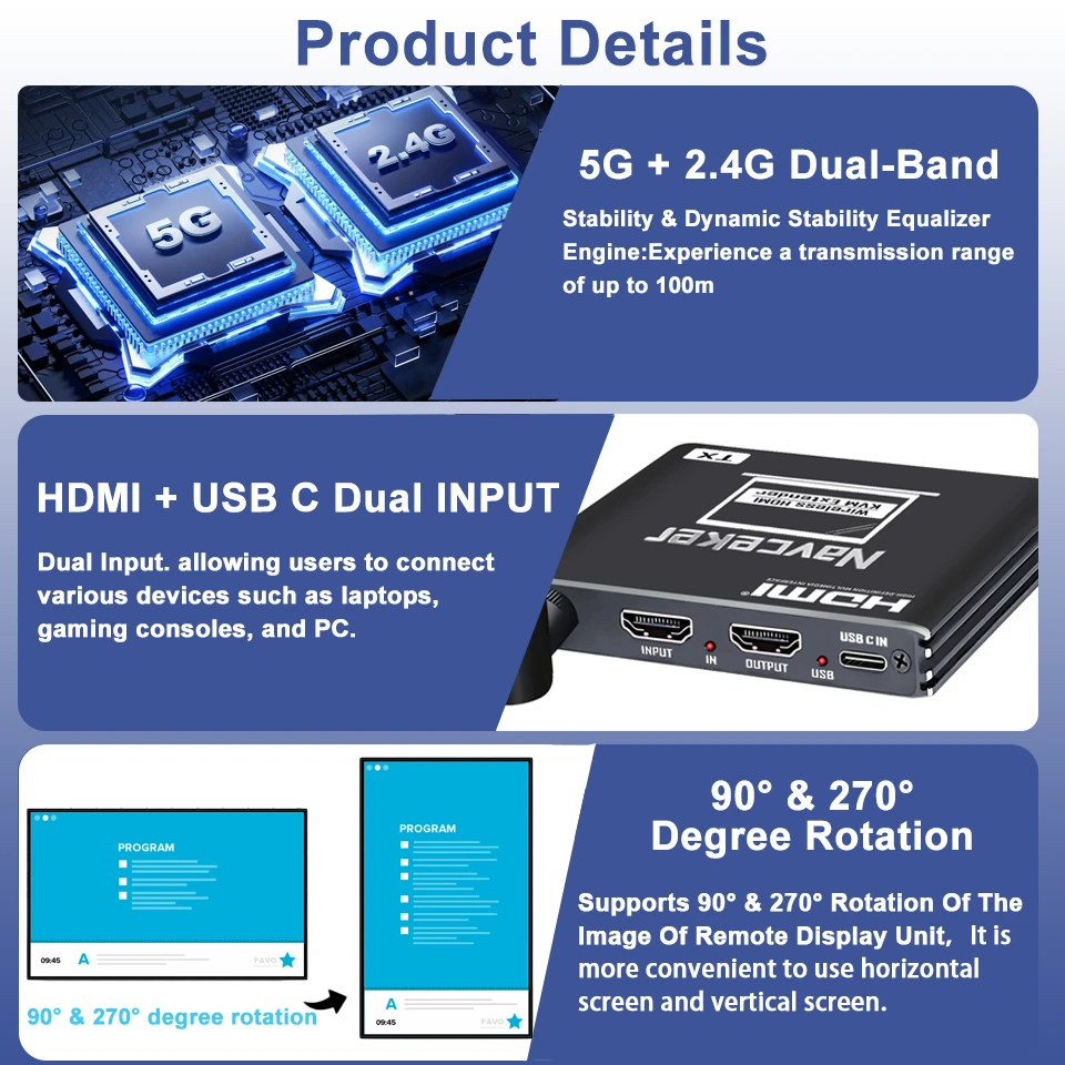 ZYAD93, Navceker 무선 HD 비디오 솔루션은 PC/HDTV와 같은 모든 HDMI 비디오 소스에서 HDTV/HD 모니터를 포함한 디스플레이 장치로 2.4/5.8GHz 듀얼 밴드를 통해 매우 낮은 대기 시간으로 비디오/오디오를 무선으로 전송할 수 있습니다.