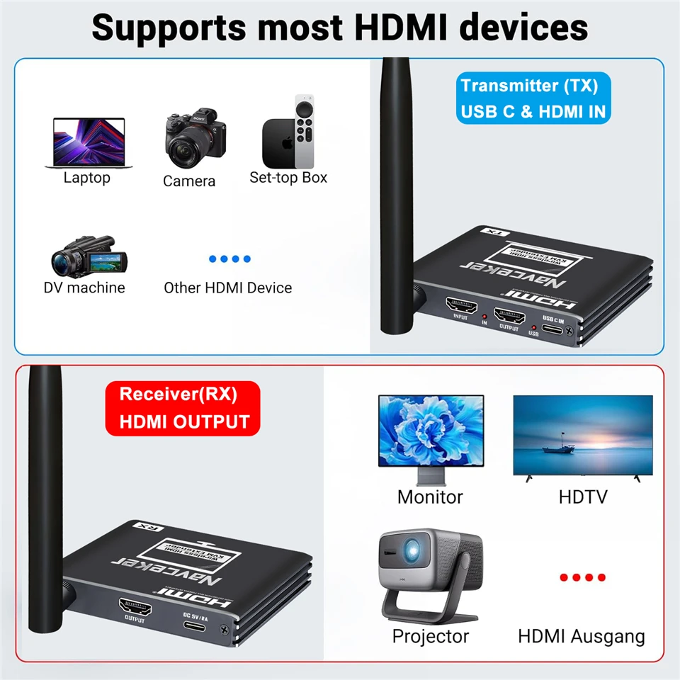 2.4GHz/5.8GHz HDMI 무선 전송: 이 무선 HDMl 송신기 및 수신기 키트는 단 0.1초의 낮은 대기 시간(거의 실시간)으로 기존 HDMl 케이블 및 배선 연결 문제를 해결합니다.모든 비디오 및 오디오 콘텐츠를 더 큰 화면으로 쉽게 스트리밍할 수 있습니다.영화 감상, 라이브 스포츠, 게임, 멀티미디어 교육, 비즈니스 미팅 및 홈 엔터테인먼트에 이상적입니다.