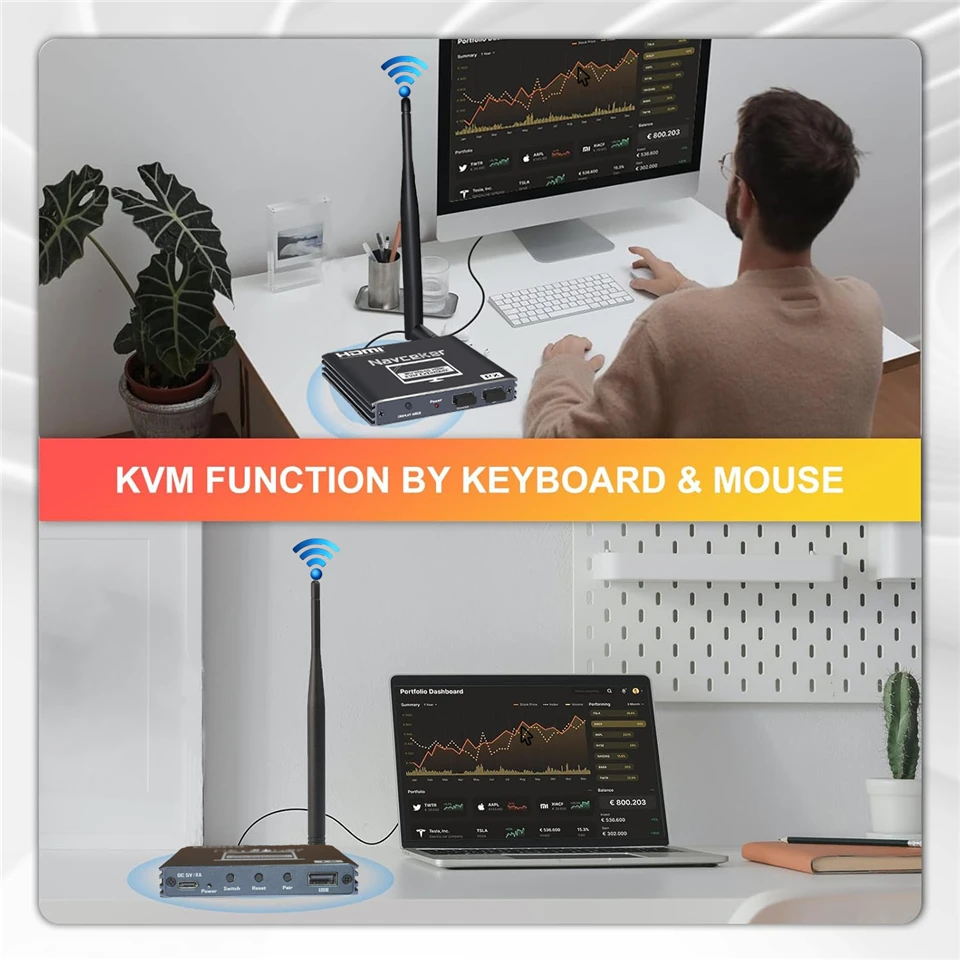 KVM 제어: 무선 전송을 통한 이 KVM 확장기는 RX 끝에서 마우스 및 키보드와 연결하여 TX 끝에서 원격 컴퓨터를 제어하고 WIFI를 통해 키보드 및 마우스 데이터를 전송하고 원격 신호 소스를 쉽게 제어할 수 있습니다.
