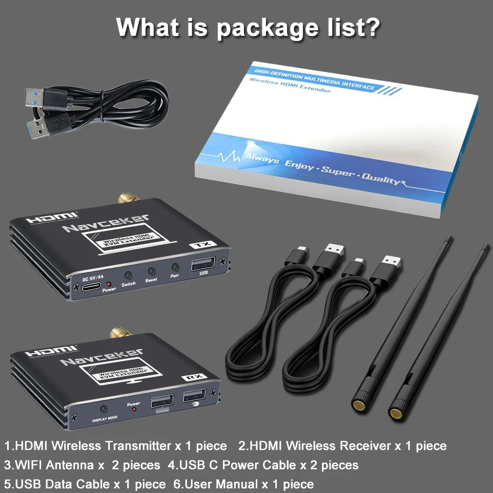 당신이 얻는 것: HDMI 연장기 1쌍(송신기 1개 및 수신기 1개), TypeC POWER LOGIC 케이블 2개, WIFI 안테나 2개, USB 데이터 케이블 1개, 사용자 설명서 1개