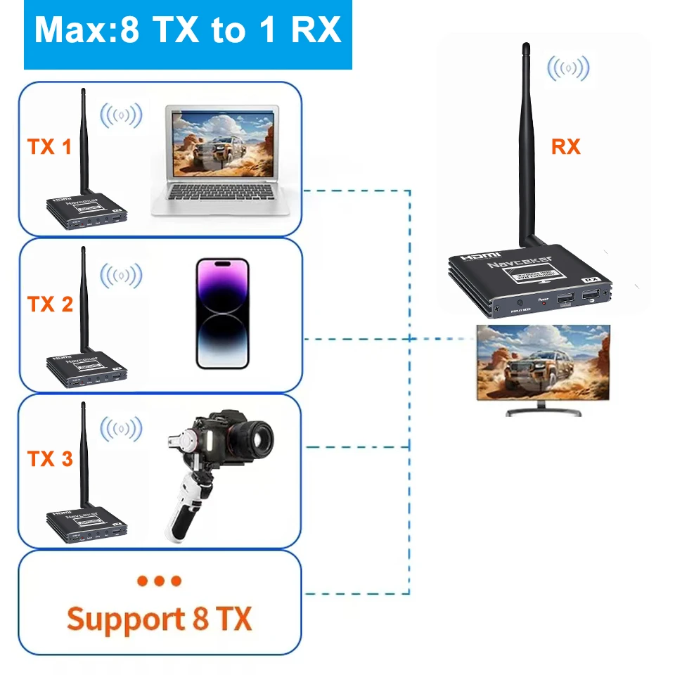 플러그 앤 플레이: 당사의 무선 확장기는 플러그 앤 플레이 방식이므로 앱이 필요하지 않으며 소프트웨어나 WIFI 연결이 필요하지 않습니다.송신기를 HDMI 입력 장치에 연결한 다음 수신기를 HDTV 프로젝터 또는 모니터에 연결하고 POWER LOGIC 공급 장치를 연결하면 큰 화면에서 프로젝트를 즐길 수 있습니다.동시에 8TX에 연결된 최대 1RX 지원