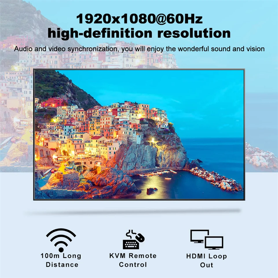 최대 100m 전송: 고급 5G/2.4 프로토콜로 구동되는 이 확장기는 안정적인 100m 범위 전송을 제공합니다.벽과 장애물을 쉽게 관통하여 강력한 연결을 보장합니다.호텔과 같은 대규모 설정에 이상적이며 버퍼링이나 신호 끊김 없이 여러 방이나 층 간에 원활한 스트리밍이 가능합니다.실제 테스트와 같이 TX와 RX 사이에 벽이 하나 있으면 오디오 비디오 신호를 최대 40~50미터까지 전송할 수 있습니다.