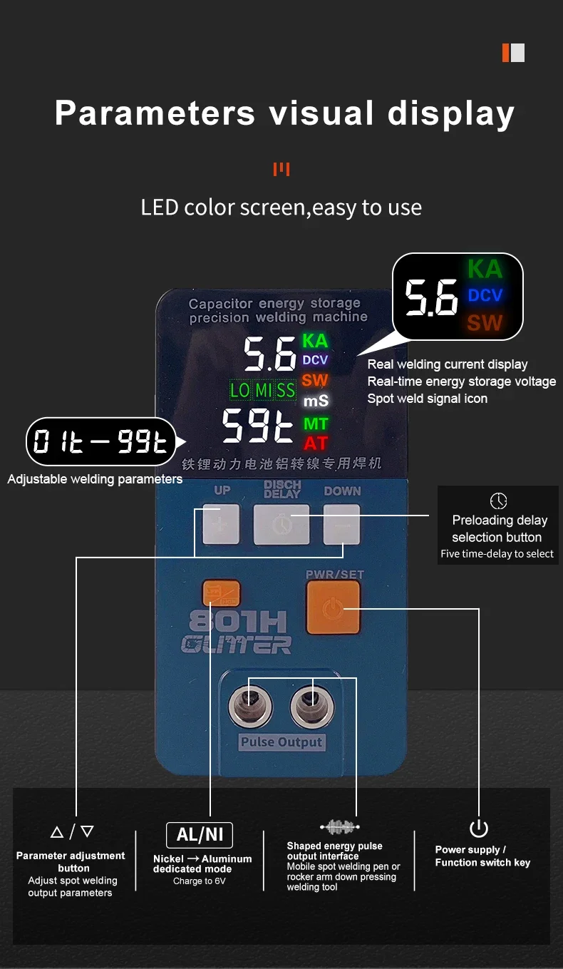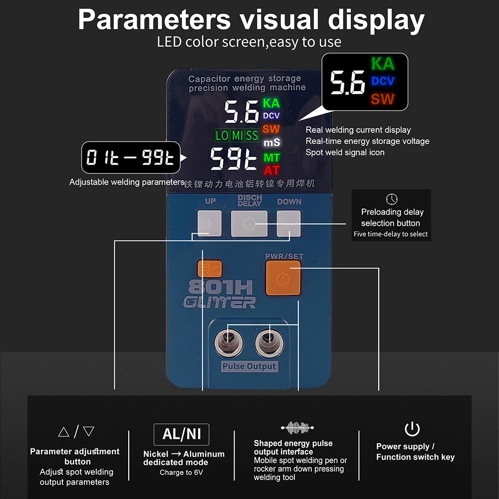 7.최대 펄스 용접 전류는 A에 도달할 수 있어 니켈 → 니켈 용접을 단단히 지원하고 알루미늄 → 니켈 용접을 단단히 지원합니다.