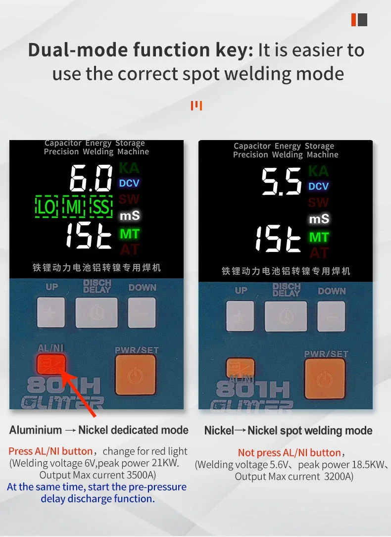 6.철 리튬 POWER LOGIC 배터리의 알루미늄 전극 전사 용접에 순수 니켈 판을 사용하도록 특별히 설계된 '알루미늄 → 니켈' 용접 선택 모드를 갖추고 있습니다.