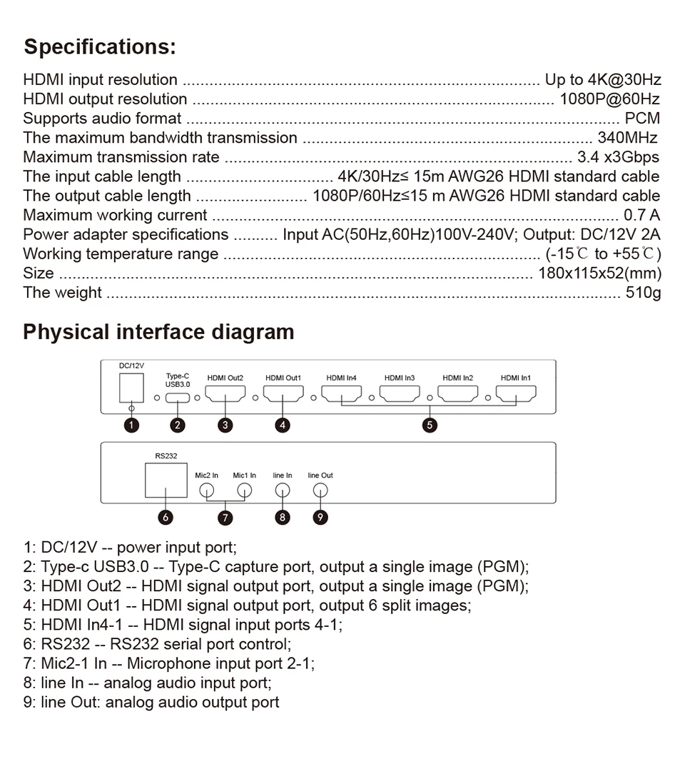 입력 케이블 길이 ........... 4K/30Hz≤ 15m AWG26 HDMI 표준 케이블