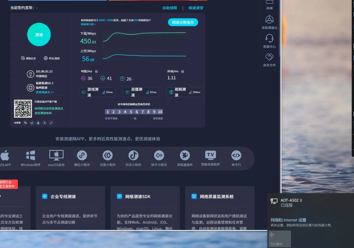 장치 관리자는 네트워크 포트를 인식할 수 있습니다.네트워크 케이블을 연결한 후에는 인터넷에 정상적으로 접속할 수 있습니다. (테스트 장치의 네트워크 속도 제한으로 인해 네트워크 속도는 450Mbps에 불과합니다.)