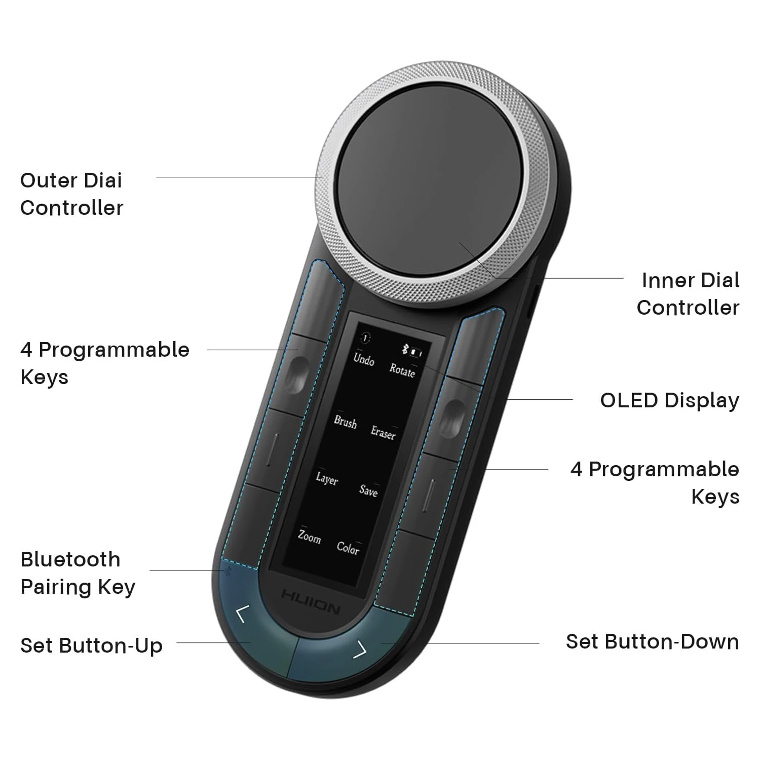 Huion Keydial Remote에는 모든 누름 키 기능을 기억할 필요 없이 표시하는 OLED 화면이 있습니다.이는 학습 곡선을 크게 줄이고 효율성을 향상시킵니다.
