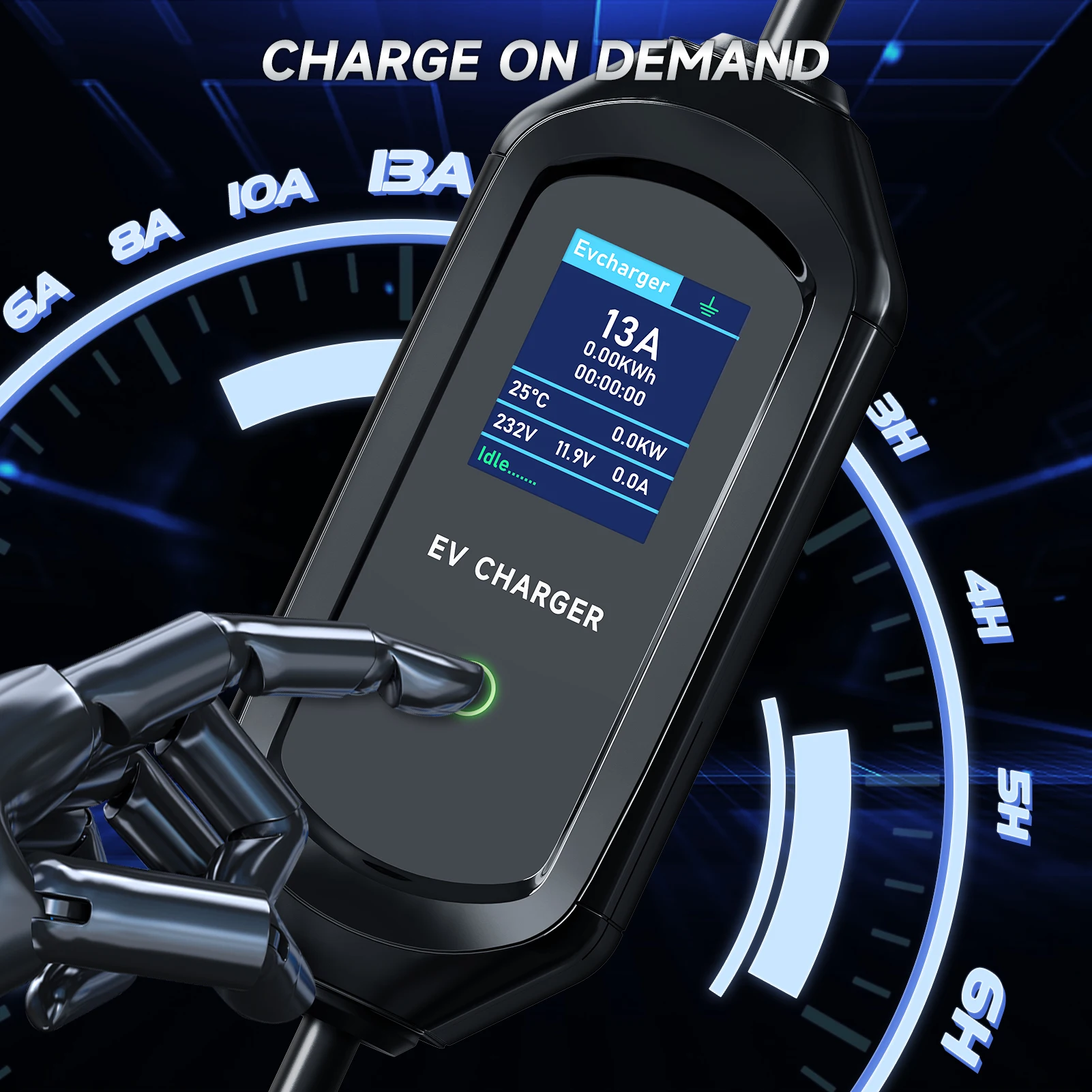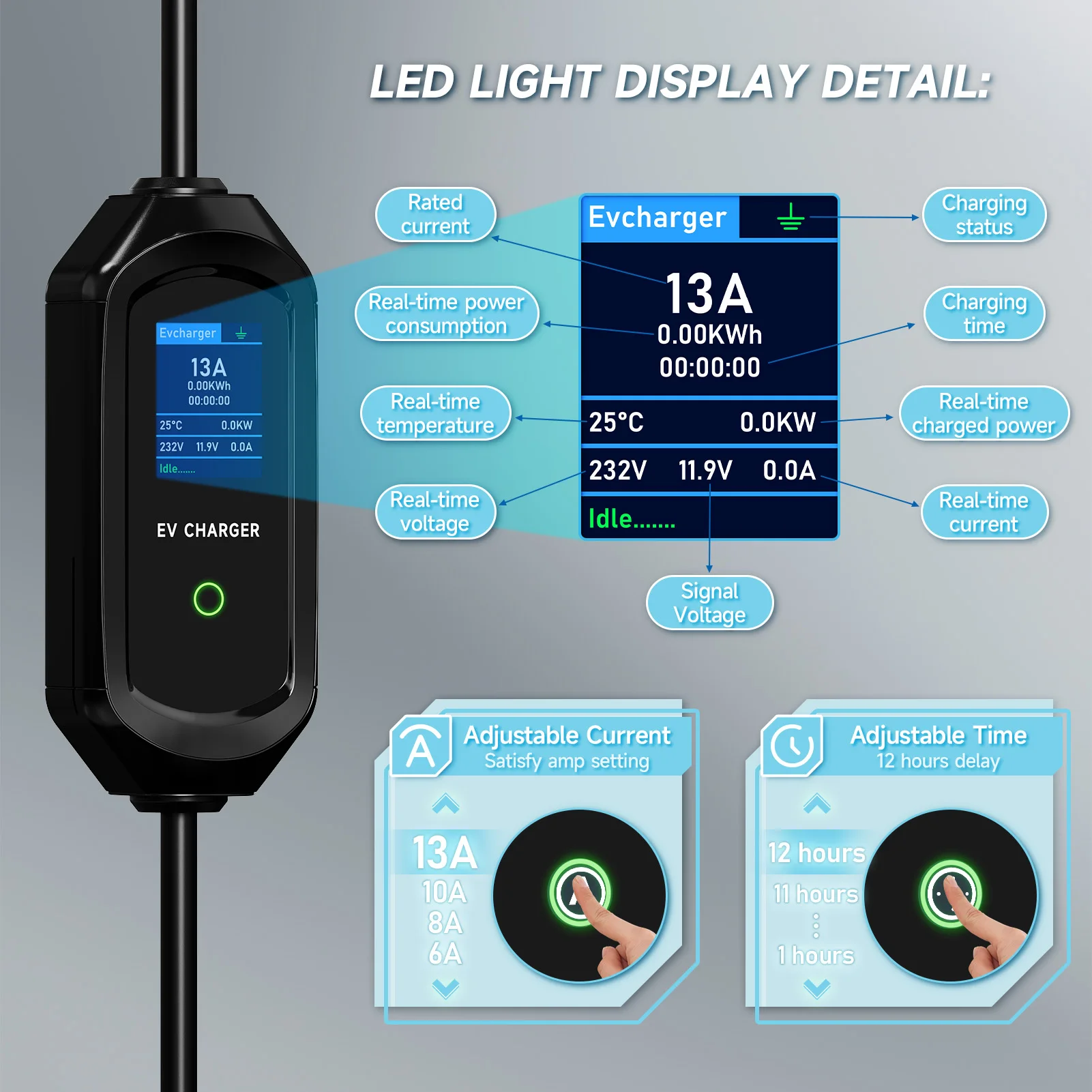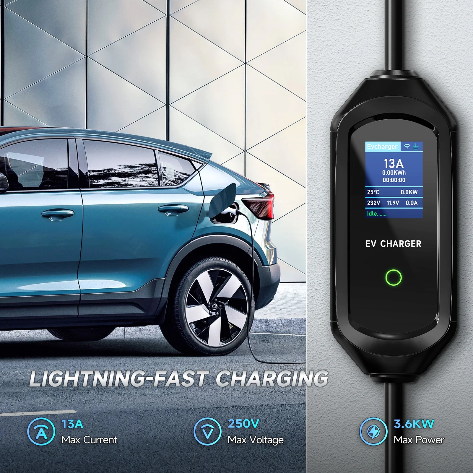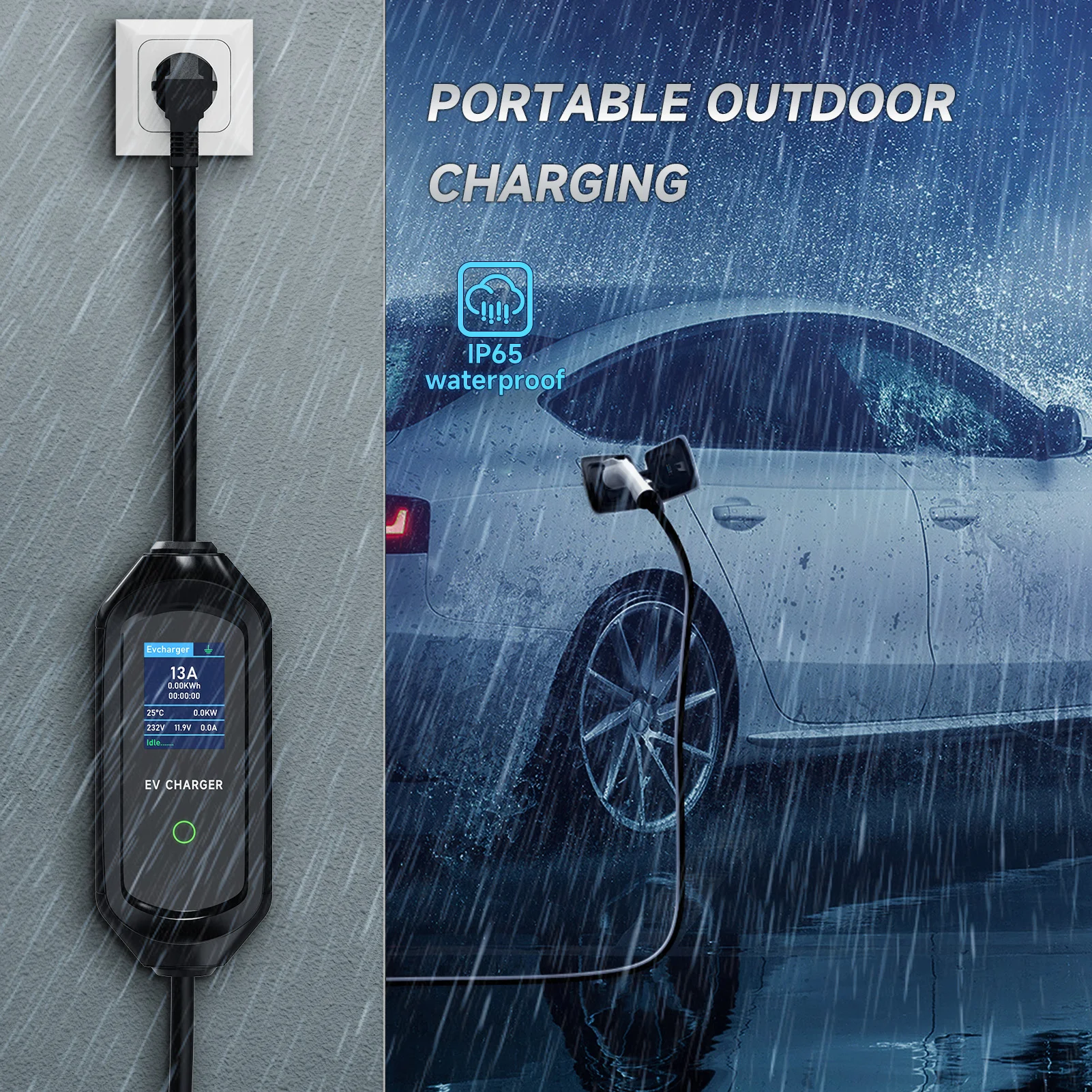 빠르고 쉬운 조작:여행하거나 친척 및 친구를 방문 할 때 청구에 대해 걱정할 필요가 없습니다. 왜냐하면 우리 충전기 차 가지고 다닐 수 있고 충전기의 OLED 스크린 모든 충전 데이터 확인할 수 있기 때문입니다. EV 입구 플러그 연결하면 충전기가 자동으로 연결 상태를 감지하고 충전을 시작합니다. 충전 상태에서 파라미터를 설정할 수 없습니다. 충전 전에 설정하십시오.