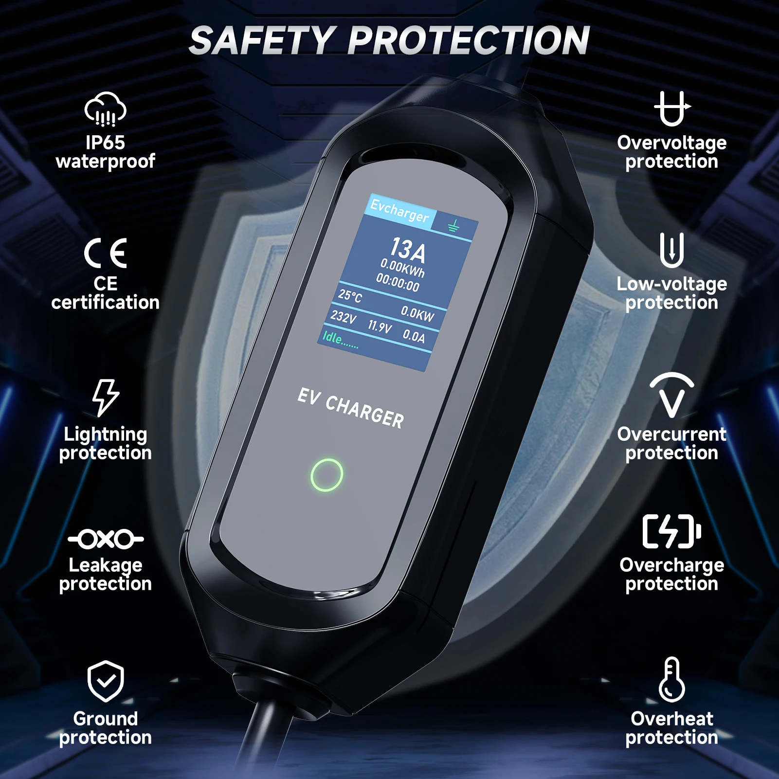 하이 퀄리티 및 보안:과전류 보호, 과전압 보호, 저전압 보호, 누출 방지, 과열 보호, IP65 방수 등급 및 기타 안전 보호 조치를 갖춘 견고하고 강력합니다. 충전 스테이션의 표시등은 다양한 충전 단계를 표시하고 가능한 오류를 경고하는 데 도움이됩니다.