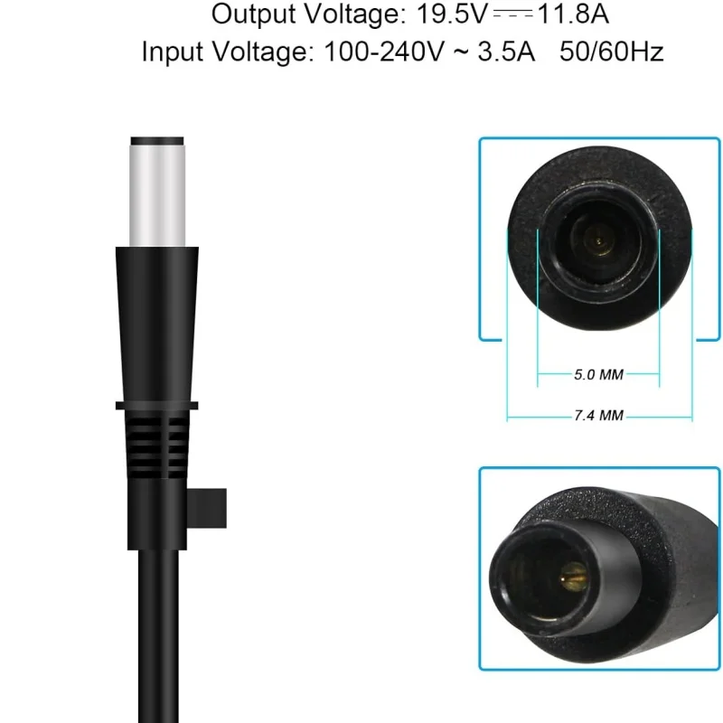 제품 사양: POWER LOGIC 입력: 국제 사용을 위한 100240V; 출력: 19.5V 11.8A 230W. 커넥터 크기: 7.4mm X 5.0mm (1 핀 내부) (인터페이스는 일관성이 있음). 5.5x2.5mm 내부에 핀이 없거나 4 홀이 있는 플러그 없음