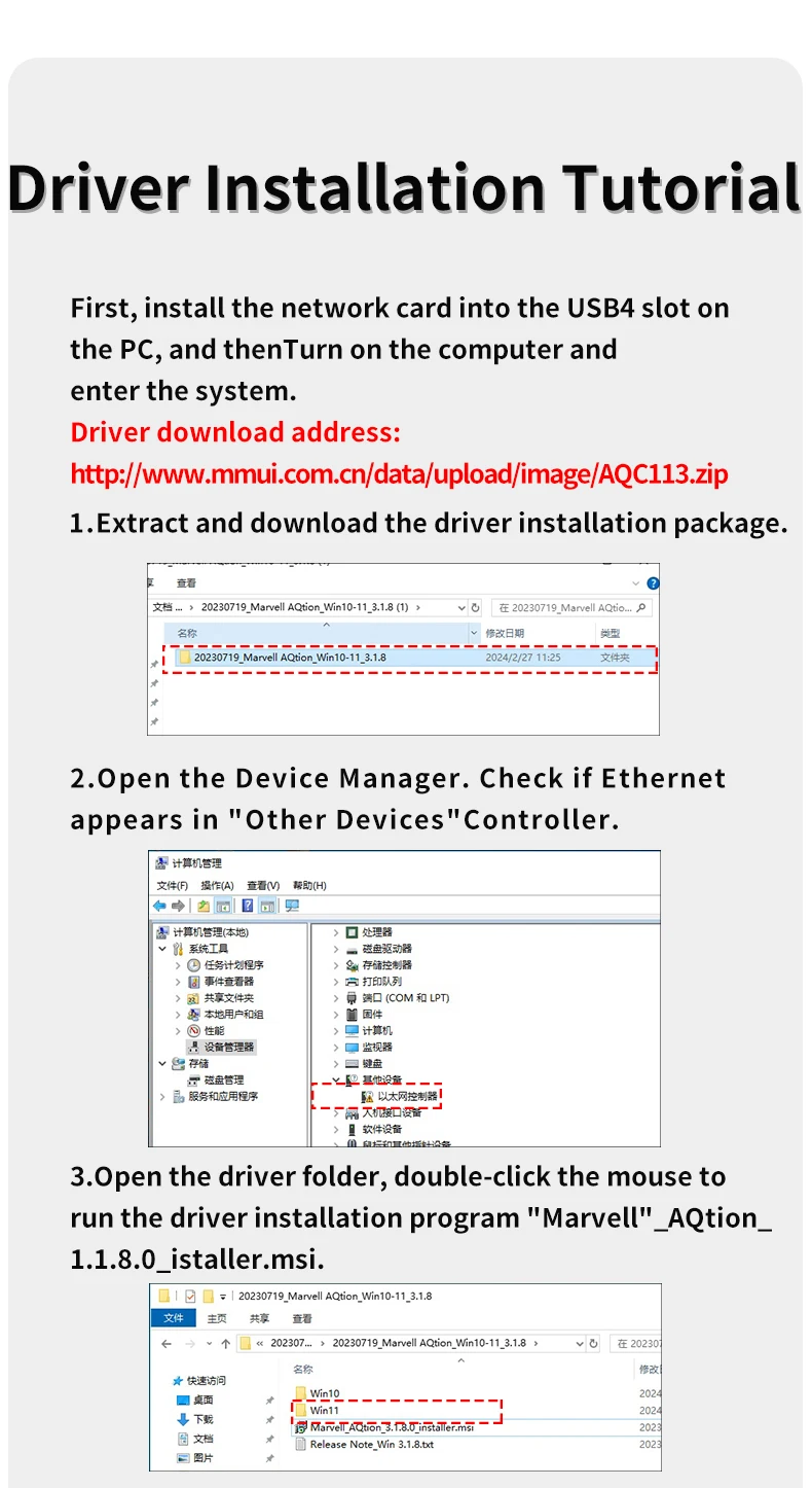 2. 네트워크 카드 드라이버를 설치합니다.다운로드 링크는 다음과 같습니다.http://www.mmui.com.cn/data/upload/image/AQC113.zip