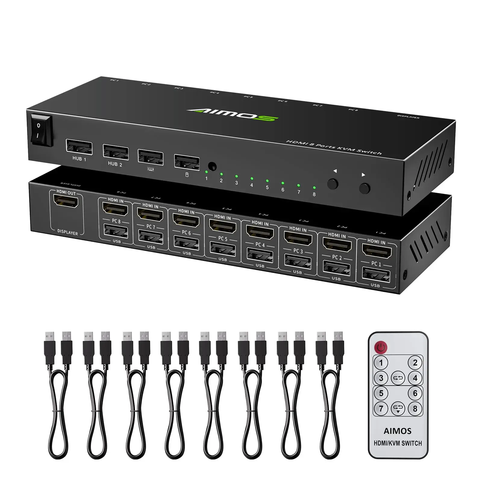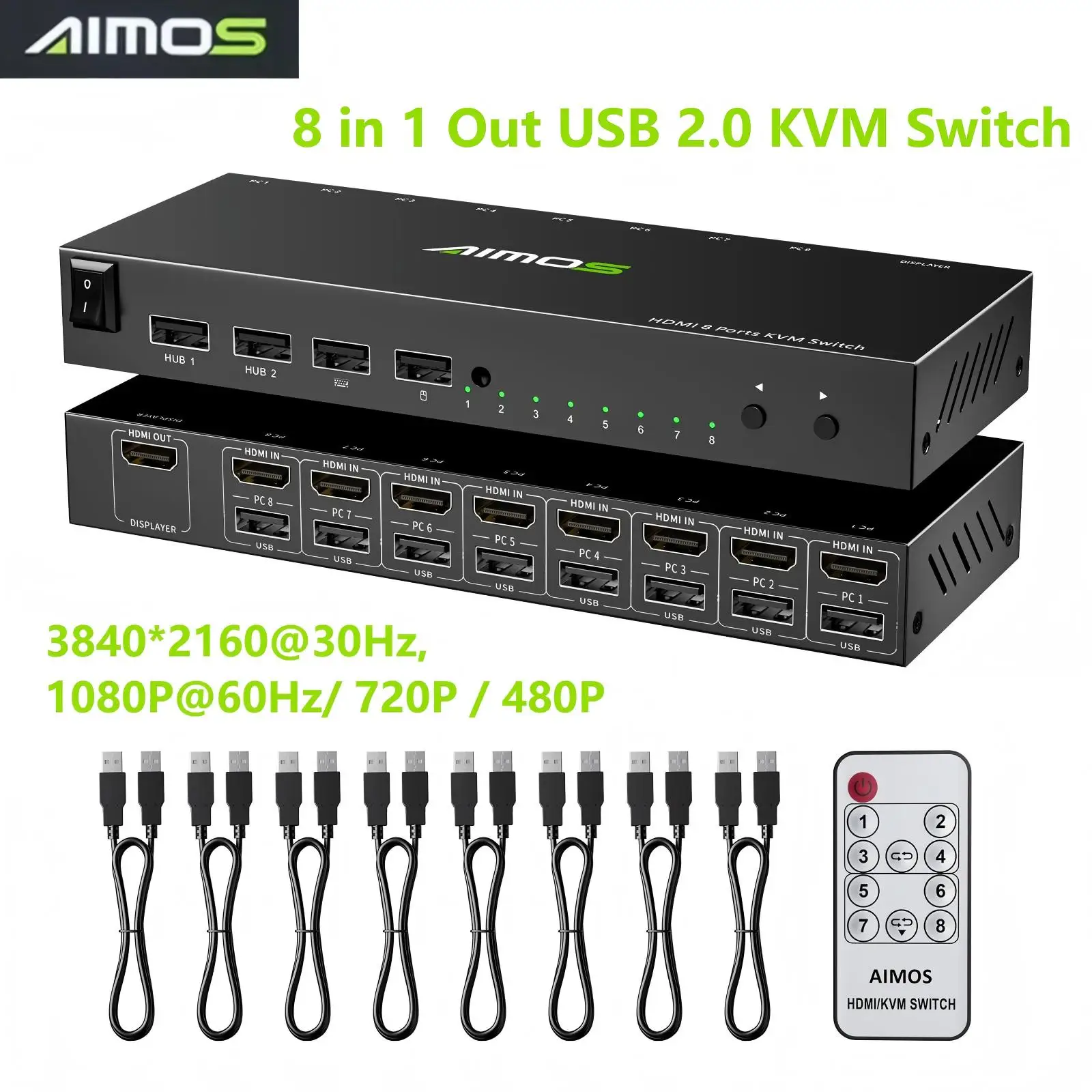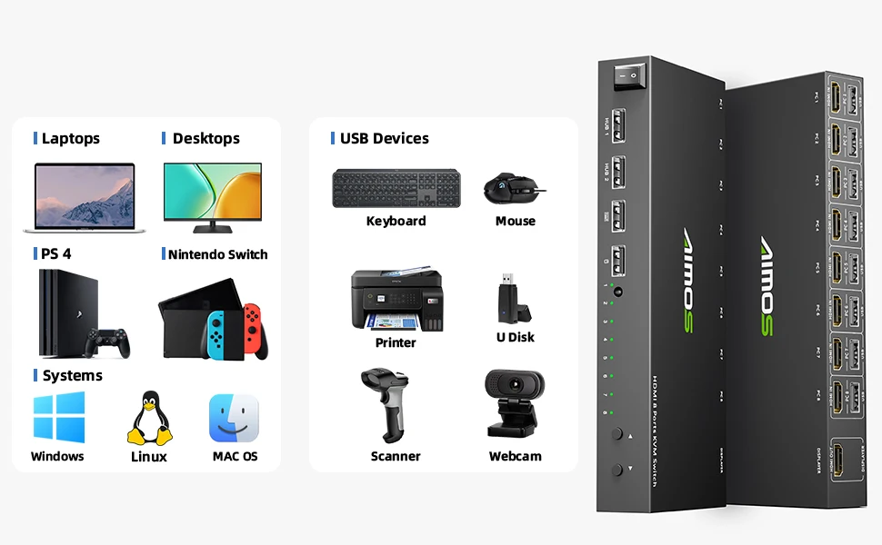 【USB2.0 HDMI KVM 스위치】키보드, 마우스, 프린터, 스캐너, 하드 드라이브 등과 같은 USB 장치를 인식할 수 있는 2개의 USB 2.0 허브 포트가 있는 KVM 스위치 8 포트.참고: 장치는 USB 수신기가 함께 제공되지 않는 Bluetooth 마우스와 키보드 간에 전환할 수 없습니다.