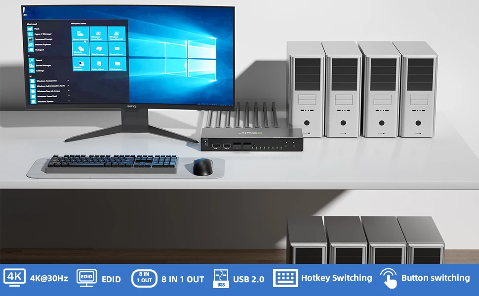 【HDMI KVM 스위치 1 모니터 8 컴퓨터】8포트 HDMI KVM 스위치는 단 하나의 유선 또는 무선 키보드 마우스 세트로 8대의 컴퓨터를 지원하며 1개의 모니터와 4개의 USB 장치를 공유합니다.추가 모니터나 키보드를 구입하지 않고도 공간과 비용을 절약하고 PC 관리 효율성을 향상시킬 수 있습니다.