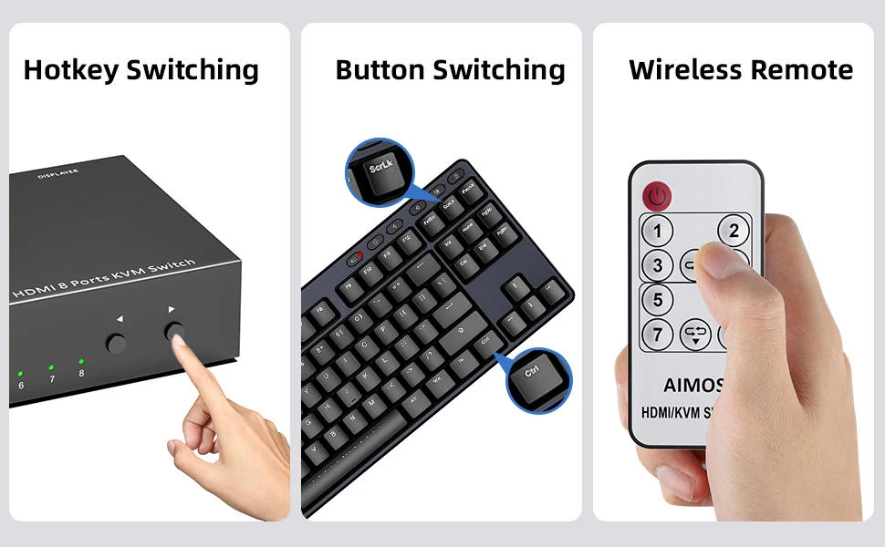 【다양한 전환 방법】이 8 in 1 out KVM 스위치는 버튼 스위치, 원격 제어 스위치 및 단축키 스위치를 지원합니다.8대의 컴퓨터 간 전환 방식을 선택할 수 있어 8대의 컴퓨터 간 전환이 더 쉽고 빨라집니다.(단축키 1: "스크롤 잠금" + "스크롤 잠금" + "1/2/3/4...8", "스크롤 잠금" 키가 없는 키보드의 경우 다른 단축키 조합을 사용하십시오. 단축키 2: "Ctrl" + "Ctrl" + "1/2/3/4...8")