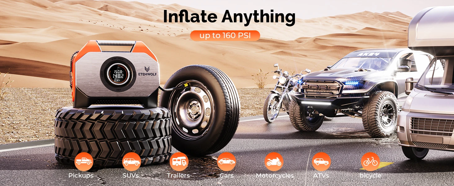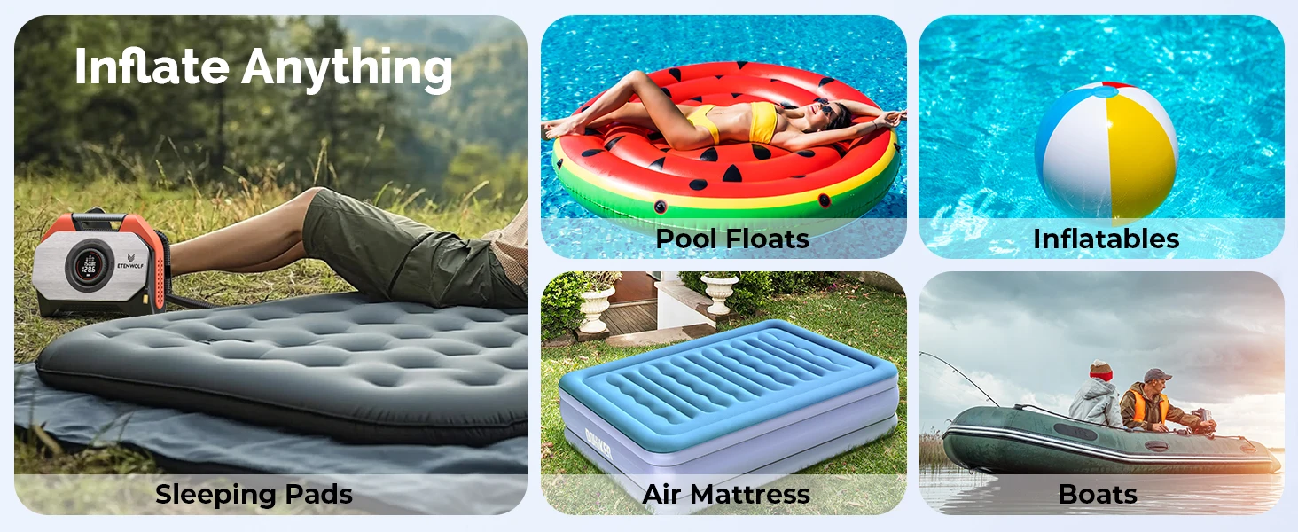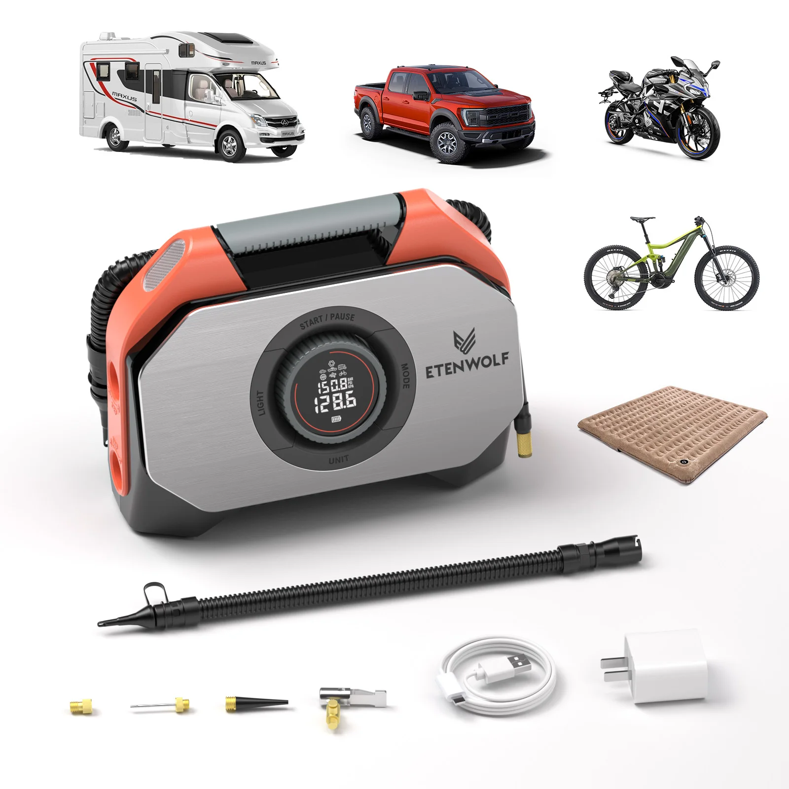 5.3가지 압력 단위: BAR, PSI, KPA; 4가지 LED 모드: 저조도, 고휘도, 느린 스트로브, SOS,7 스마트 사전 설정: 픽업, RV, 자동차, 자전거, 대용량(수영장, 플로트, 매트, 침대), 공, 맞춤형
